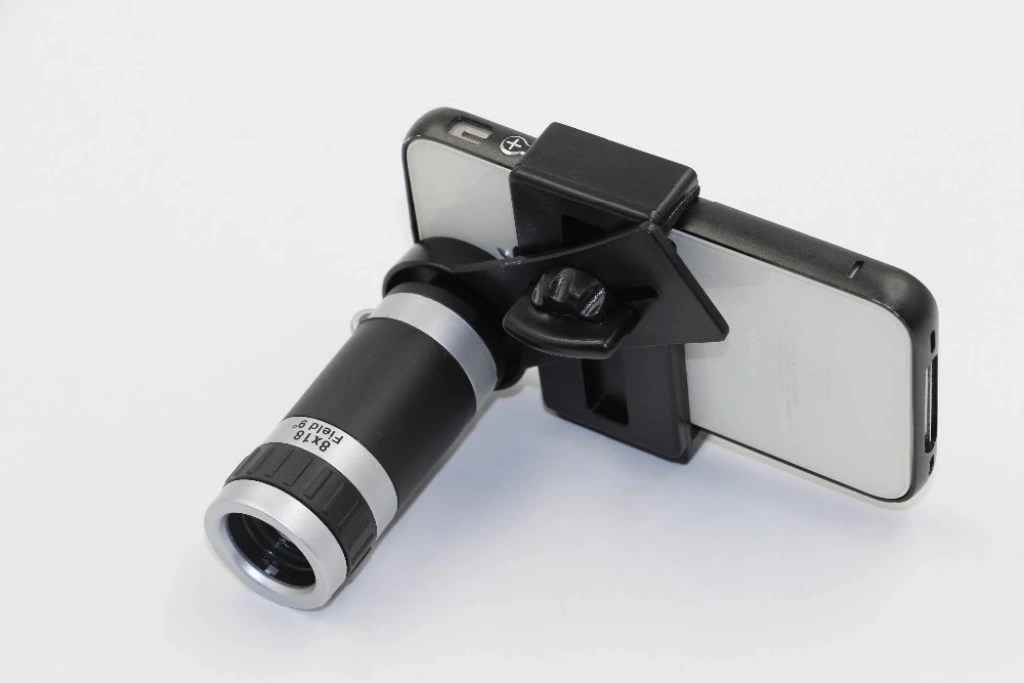 Bu lens, objektifi telefon kameraya takmak için ayarlanabilir bir montaj braketi kullanır.