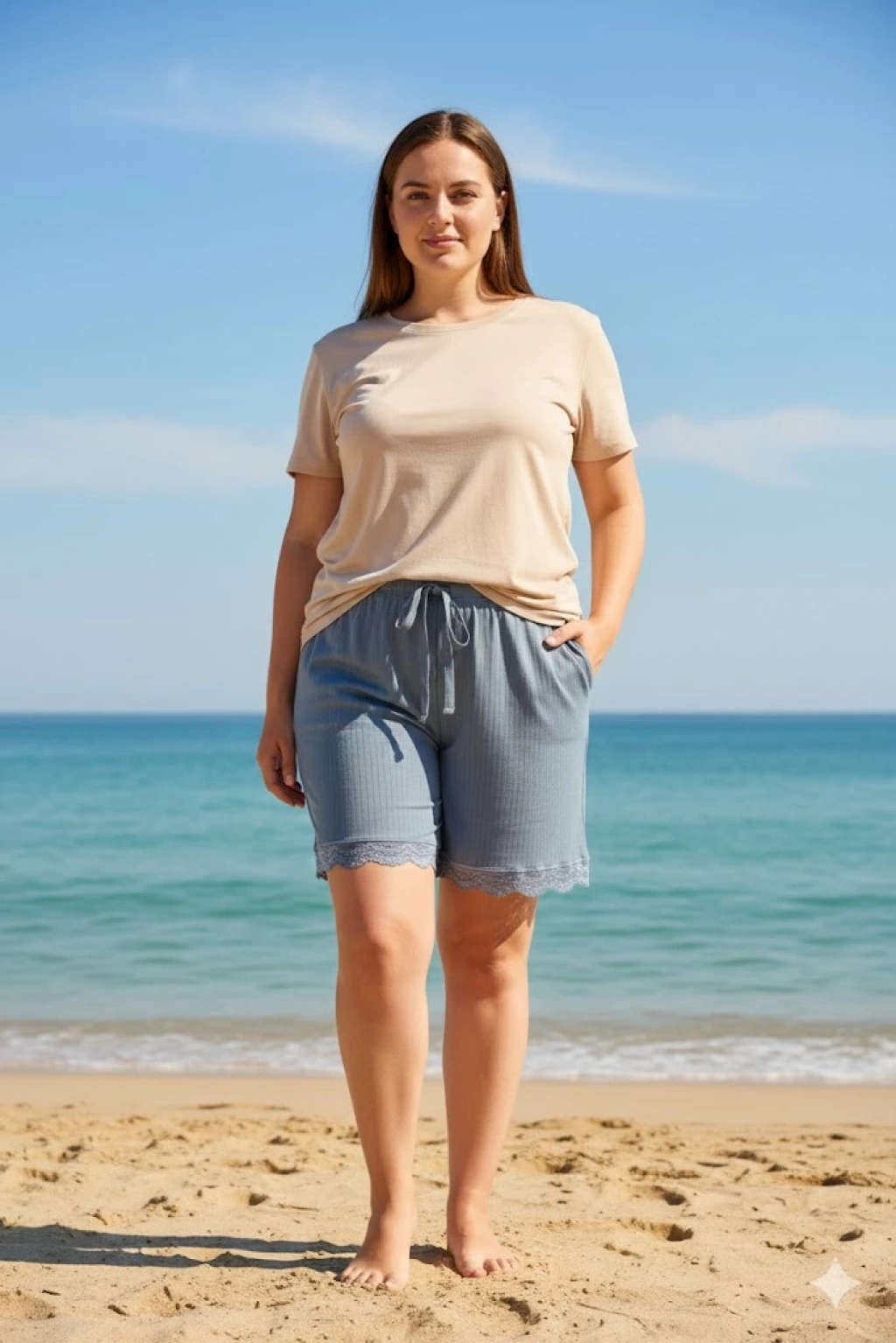 Bambu Fitilli Kadın Ev Şortu Bacak Dantel Detaylı Ev Giyim Taba