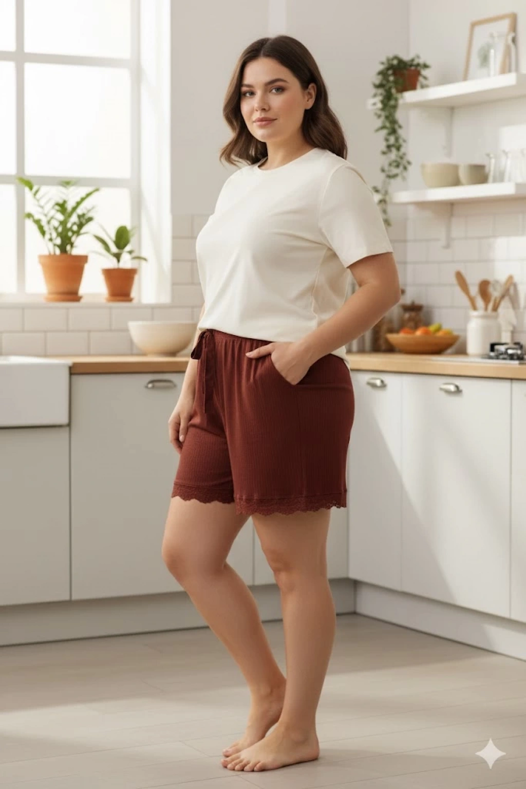 Bambu Fitilli Kadın Ev Şortu Bacak Dantel Detaylı Ev Giyim Koyu Taba