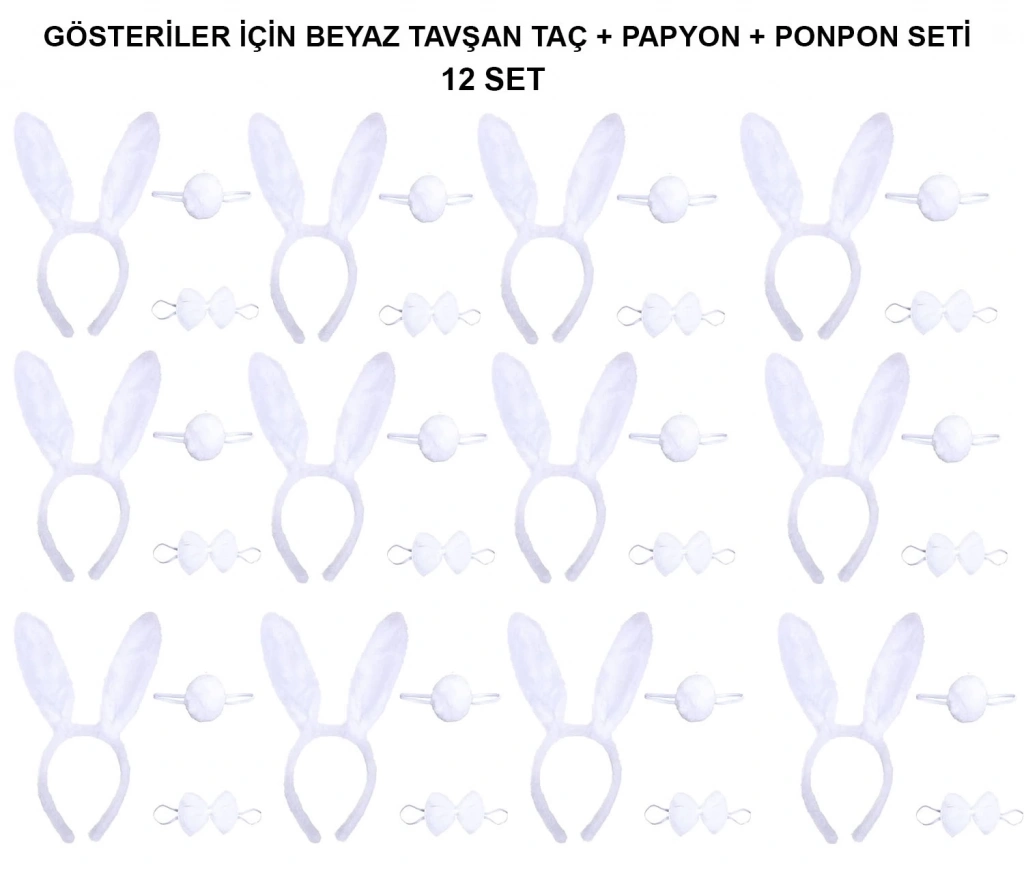 Beyaz Tavşan Kostüm Seti &ndash 12&rsquoli Paket (Taç + Papyon + Ponpon)