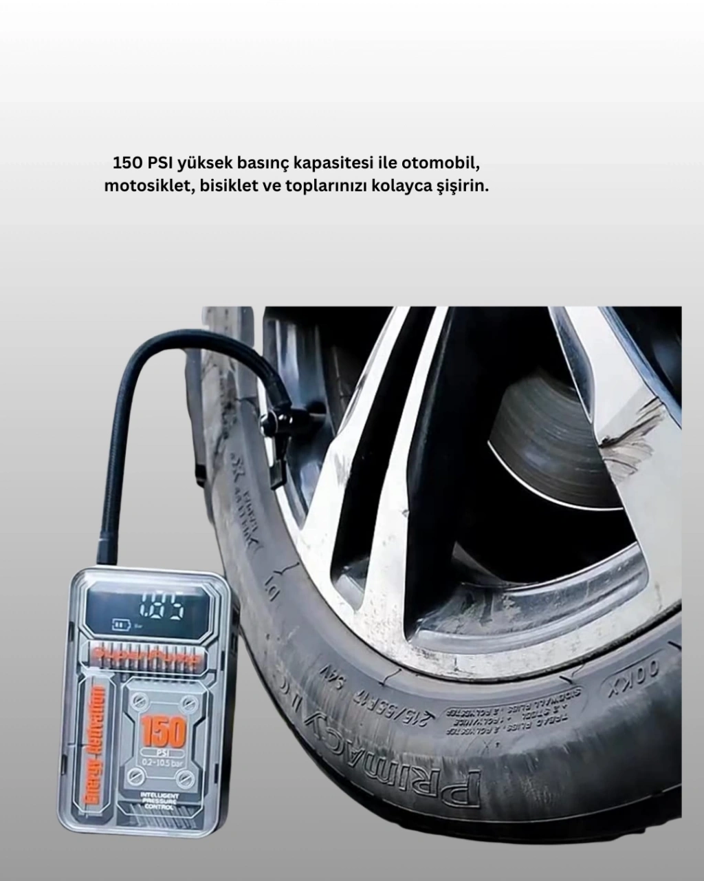 150 PSI basınç gücüne sahip bu taşınabilir kablosuz hava pompası, otomobil, motosiklet, bisiklet ve toplar için güvenilir şişirme çözümü sunar. Kompakt boyutu (82x45x134 mm) sayesinde torpido gözüne, çanta içine veya kol dayama kutusuna rahatlıkla sığar. 60W güçlü motoru ve 30000 RPM hızı sayesinde bir otomobil lastiğini 8-10 dakika içinde 0’dan 30 PSI’ye kadar şişirebilir. Tam şarjlı 6000mAh bataryası ile 4 lastiğe kadar şişirme imkanı sunar. LED ekranı sayesinde basıncı hassas şekilde ölçebilir, önceden ayarlayabilir ve güvenli bir şekilde kullanabilirsiniz. Otomatik kapanma özelliği ile fazla şişirme riskini ortadan kaldırır.