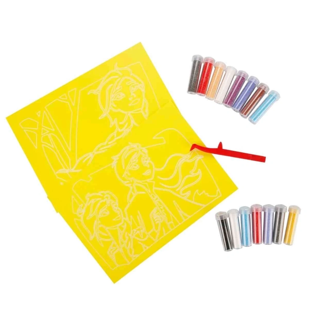 Kutu içerisinden çıkan renksiz kağıtların yapışkanlarını sökerek eğlenceye başla. Koyu renklerden başlayarak dilediğin renkteki kumu, favori karakterinin resminin üzerine doğru dök. Yapışkan sayesinde kum, kağıtta sabit kalacak ve Frozen karakterlerinden Elsa ve Anna renklenmeye başlayacaktır. Tüm resmi renklendirdikten sonra kağıt üzerinde kalan fazla kumu silkeleyerek çalışmanın son haline gururla bakabilirsin.