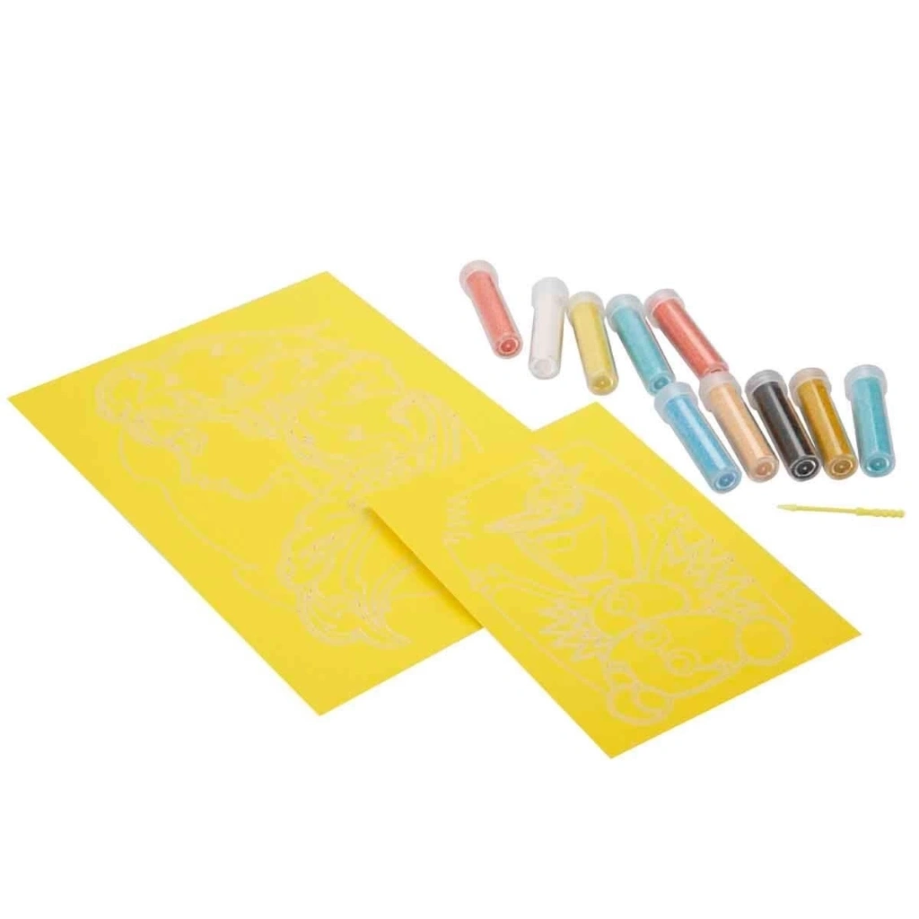 Kutu içerisinden çıkan renksiz kağıtların yapışkanlarını sökerek eğlenceye başla. Koyu renklerden başlayarak dilediğin renkteki kumu, favori karakterinin resminin üzerine doğru dök. Yapışkan sayesinde kum, kağıtta sabit kalacak ve Frozen karakterlerinden Elsa ve Olaf renklenmeye başlayacak. Tüm resmi renklendirdikten sonra kağıt üzerinde kalan fazla kumu silkeleyerek çalışmanın son haline gururla bakabilirsin.