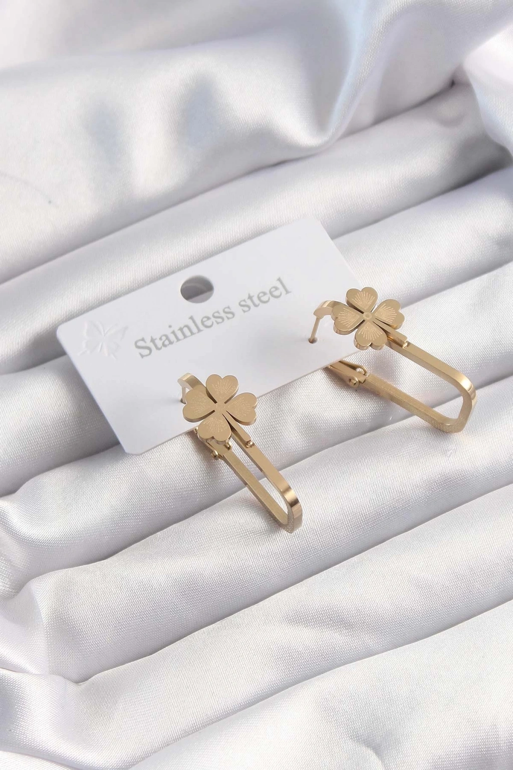 BFS 316L Çelik Gümüş Renk Beyaz Yonca Model Kadın Küpe