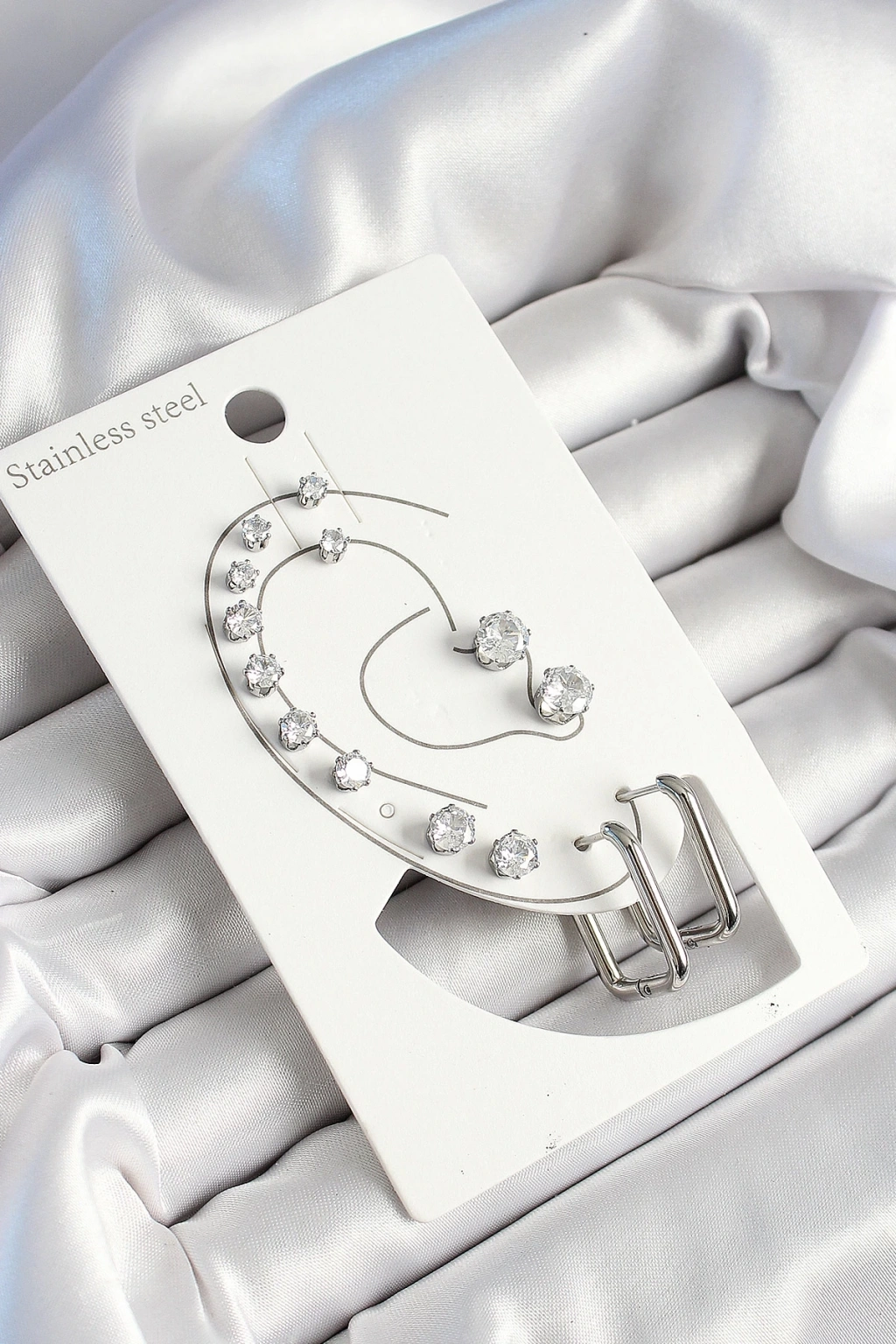 BFS 316L Çelik Dikdörtgen Figürlü Ve Zirkon Taşlı Gümüş Renk 7'li Çift Kadın Küpe Set