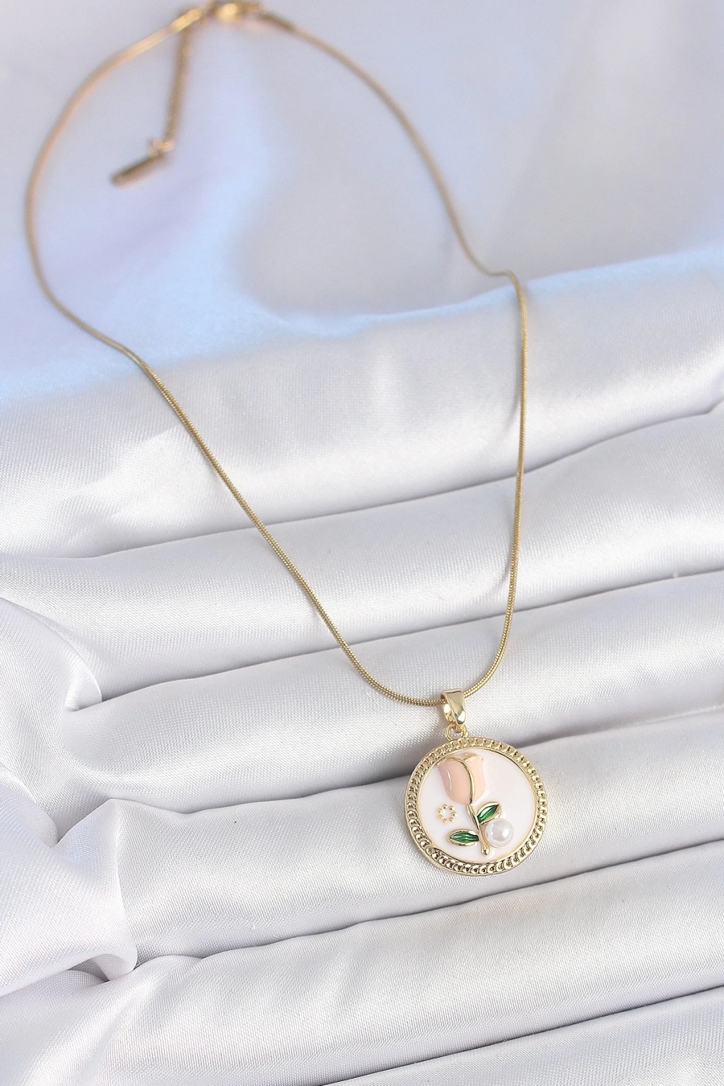 BFS 316L Çelik Gold Renk Beyaz Mineli İncili Çiçek İşlemeli Portre Model Kadın Kolye