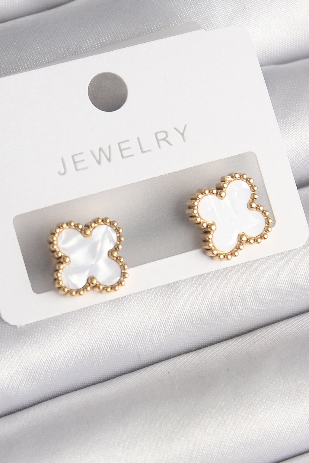 BFS 316L Çelik Gold Renk Beyaz Minelik Yonca Model Kadın Küpe