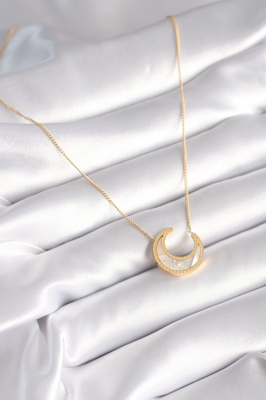 BFS 316L Çelik Gold Renk Beyaz Sedefli Hilal Model Kadın Kolye