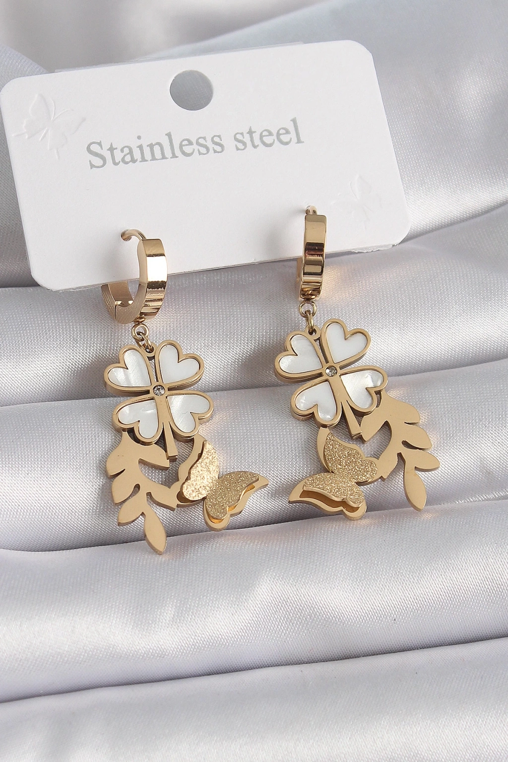 BFS 316L Çelik Gold Renk Beyaz Sedefli Yonca Simli Kelebek Figür Kadın Küpe