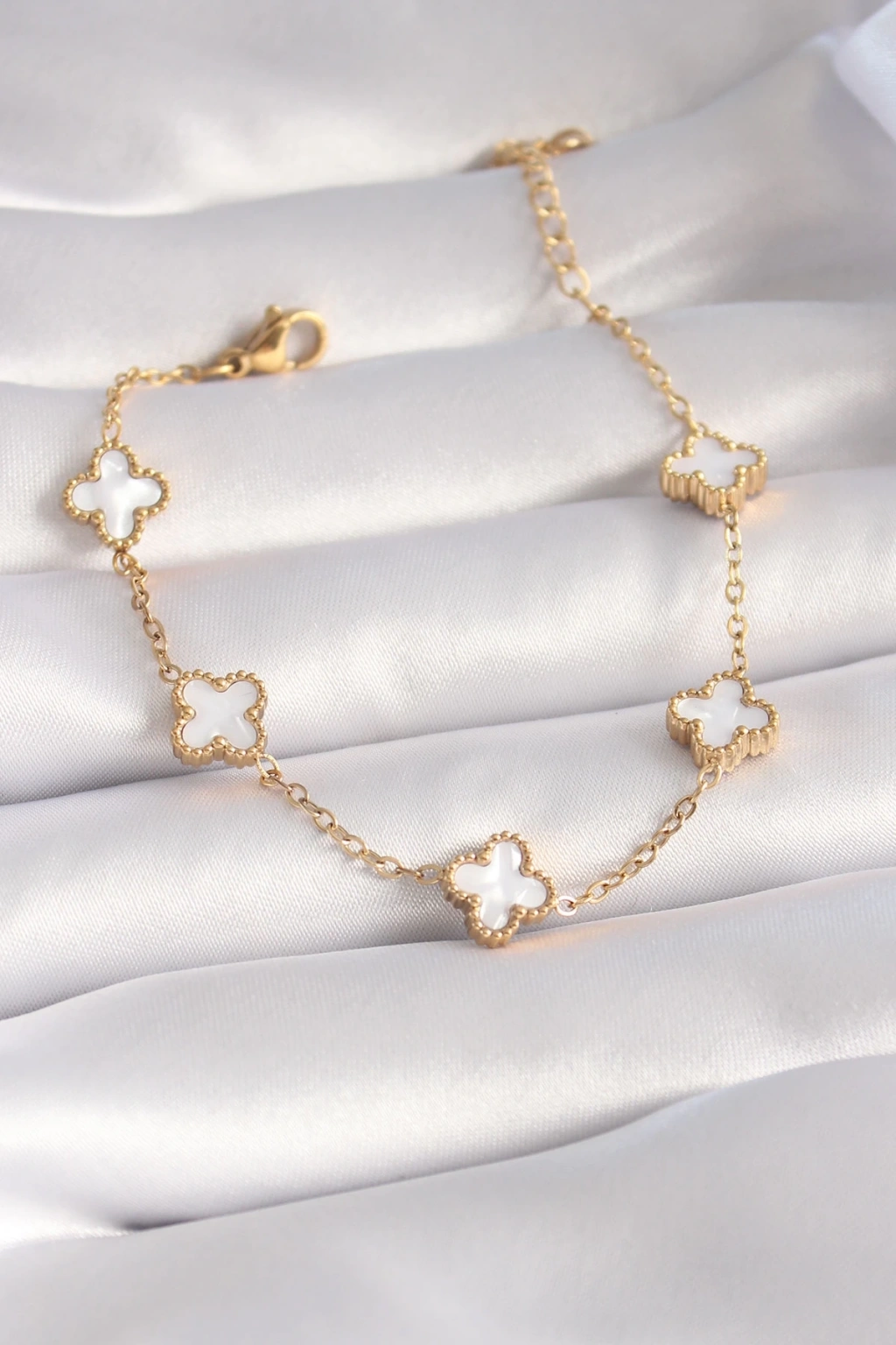 BFS 316L Çelik Gold Renk Beyaz Yonca Model Kadın Bileklik