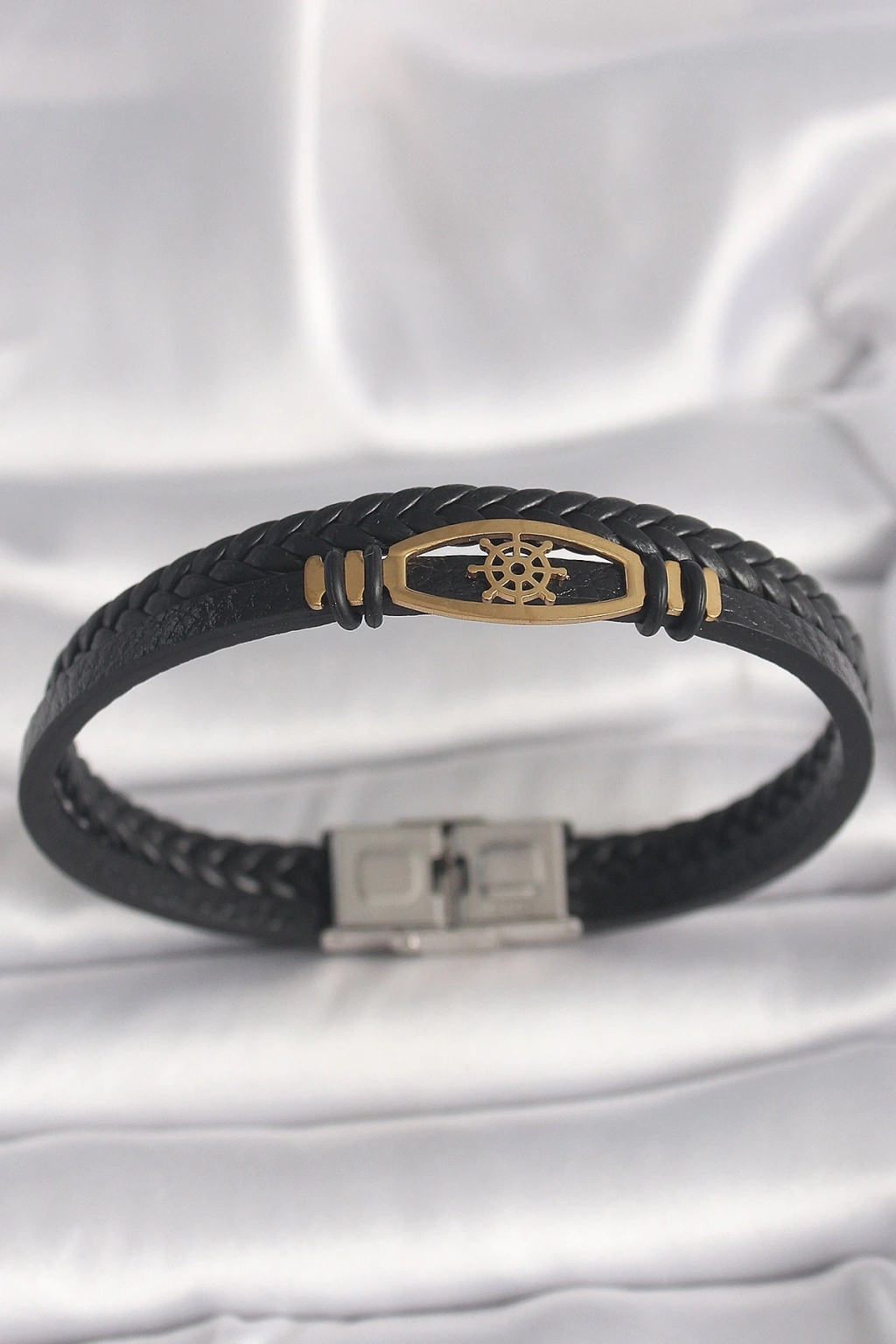 BFS 316L Çelik Gold Renk Gemi Dümen Figür Siyah Renk Çift Sıra Burgu Desenli Deri Kordon Erkek Bileklik