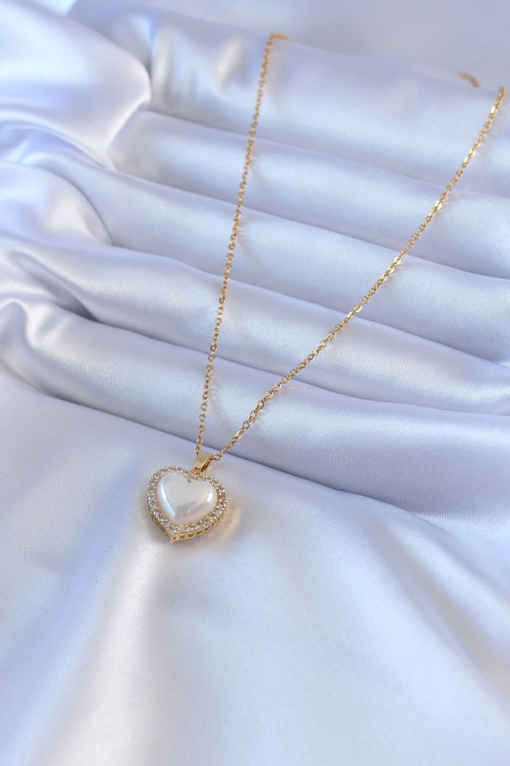 BFS 316L Çelik Gold Renk İncili Kalp Model Zirkon Taşlı Kadın Kolye