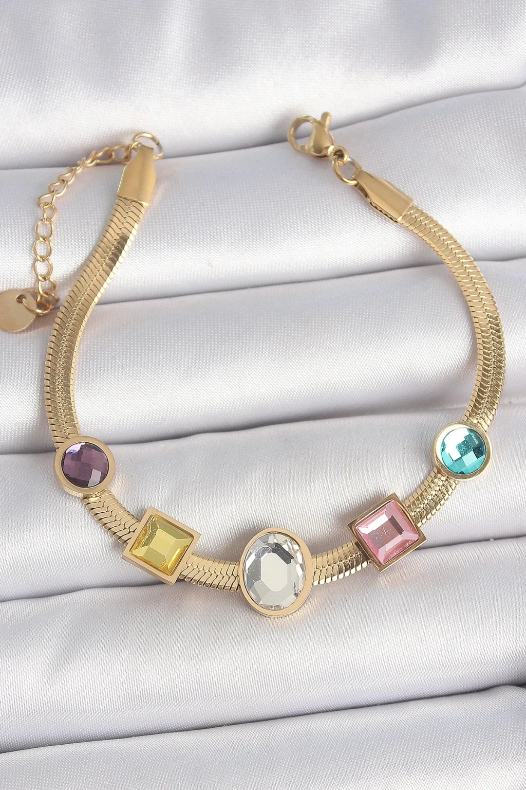 BFS 316L Çelik Gold Renk İtalyan Zincir Renkli Zirkon Taşlı Kadın Bileklik