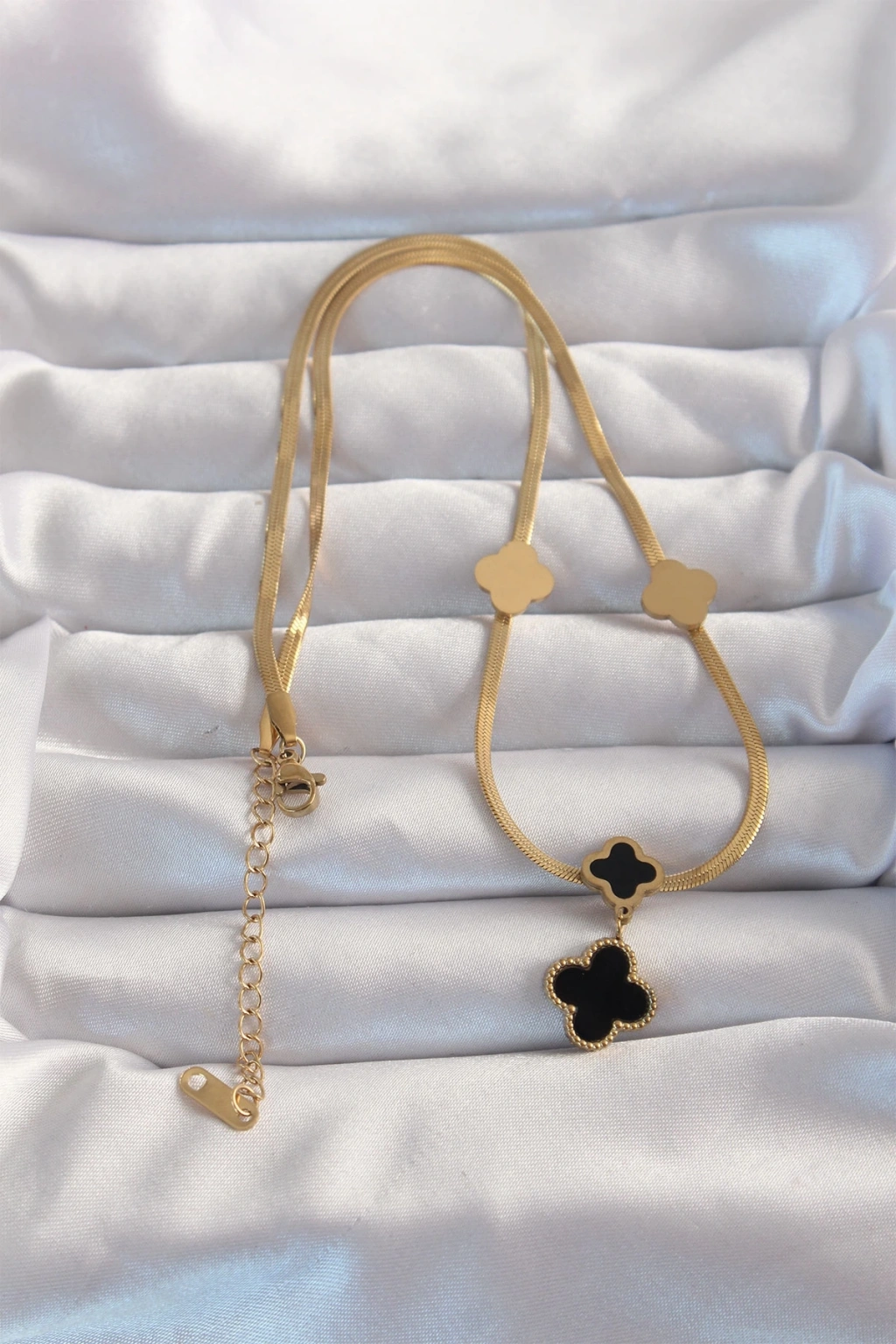 BFS 316L Çelik Gold Renk İtalyan Zincirli Mineli Yonca Kolye