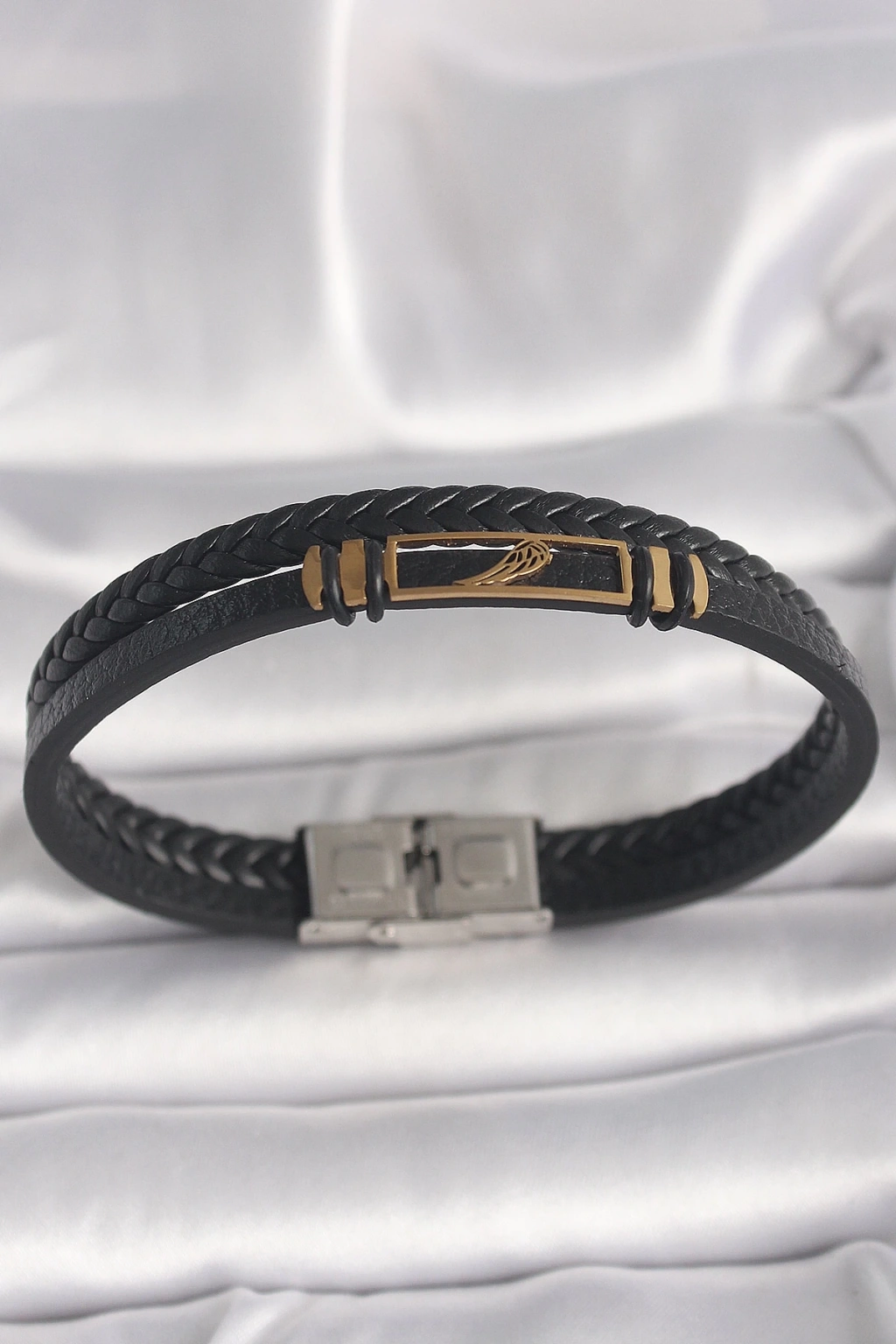 BFS 316L Çelik Gold Renk Kanat Aksesuarlı Siyah Burgu Model Deri Kordon Erkek Bileklik