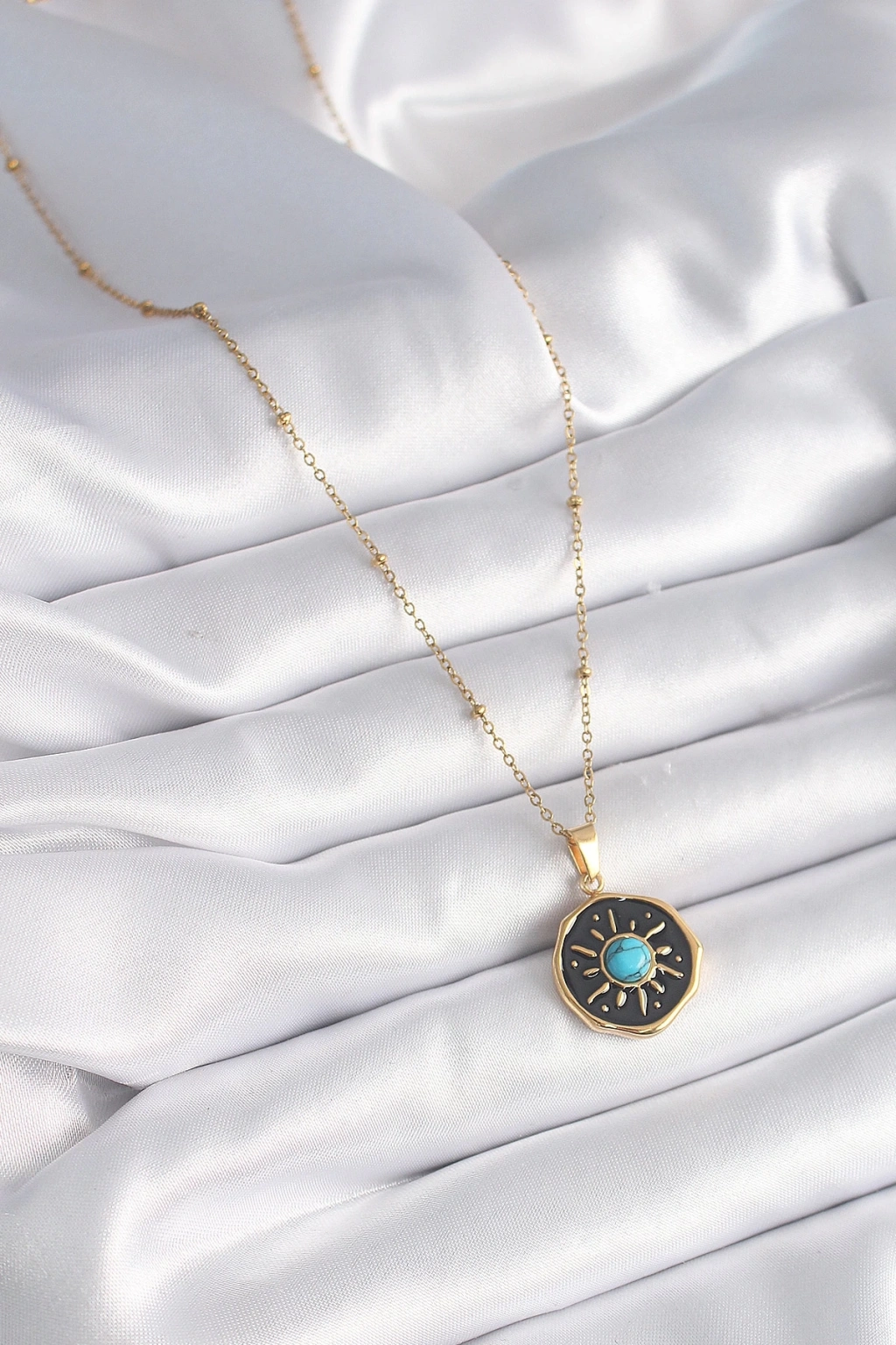 BFS 316L Çelik Gold Renk Mavi Boncuk Güneş İşleme Madalyon Model Kadın Kolye