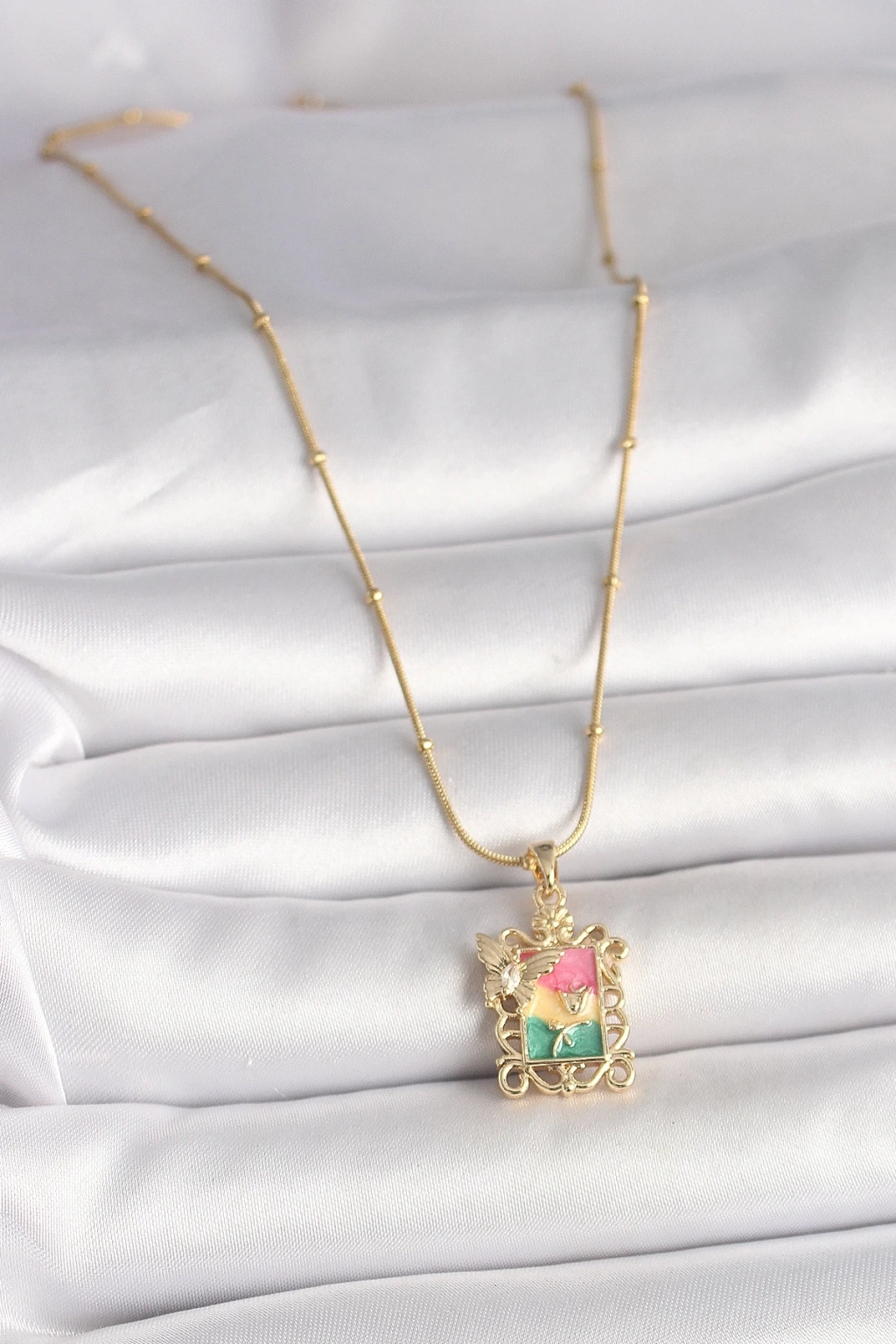 BFS 316L Çelik Gold Renk Renkli Zirkon Taşlı Kelebek İşlemeli Portre Model Kadın Kolye