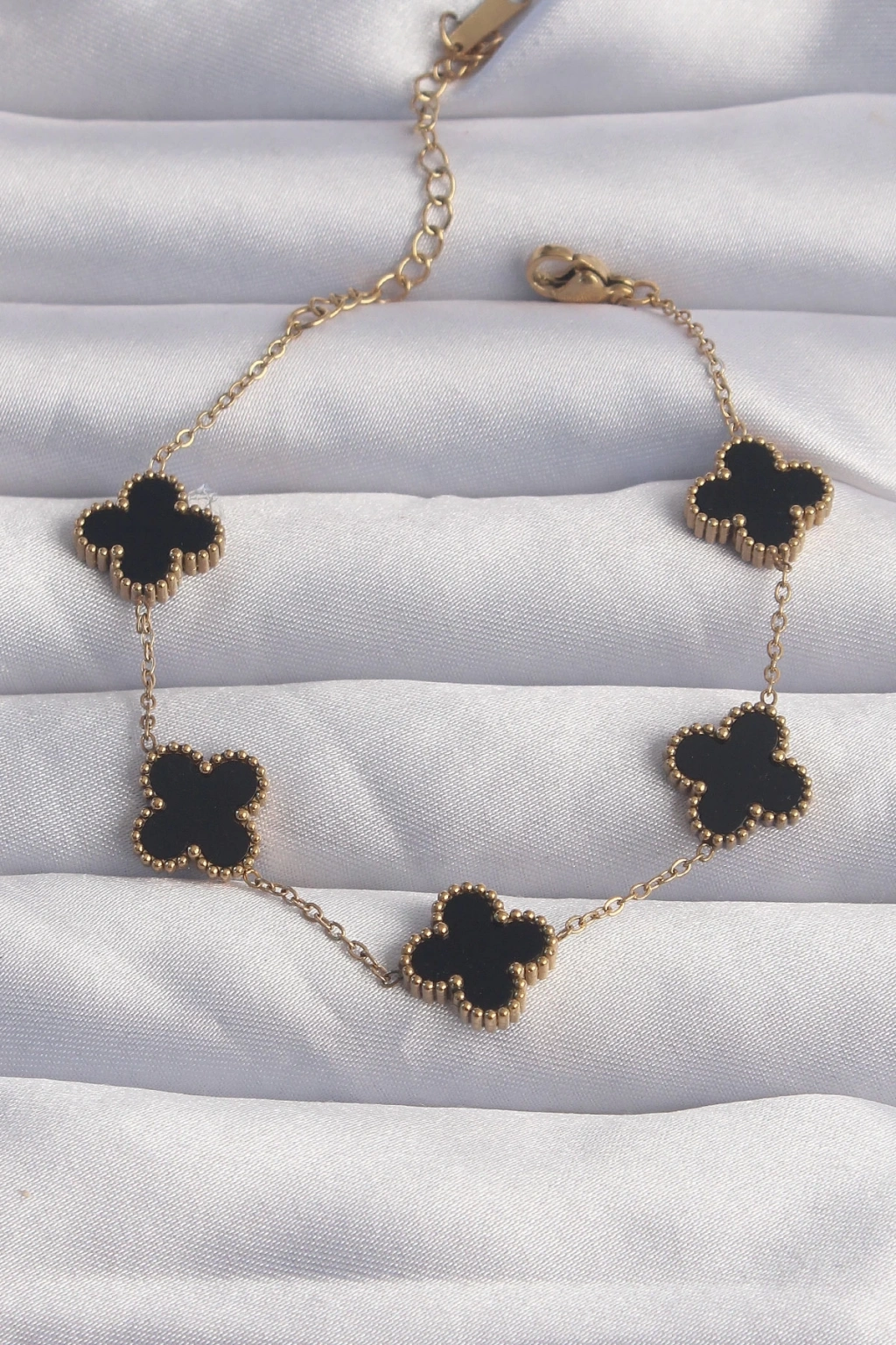 BFS 316L Çelik Gold Renk Siyah Mineli Yonca Bileklik