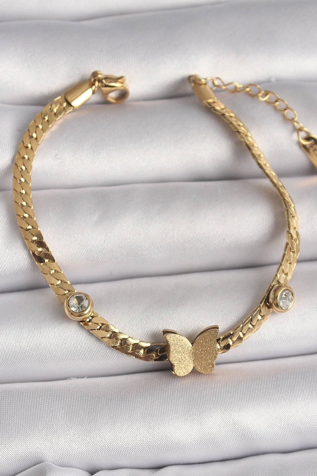 BFS 316L Çelik Gold Renk Yassı Zincir Zirkon Taşlı Simli Kelebek Figür Kadın Bileklik