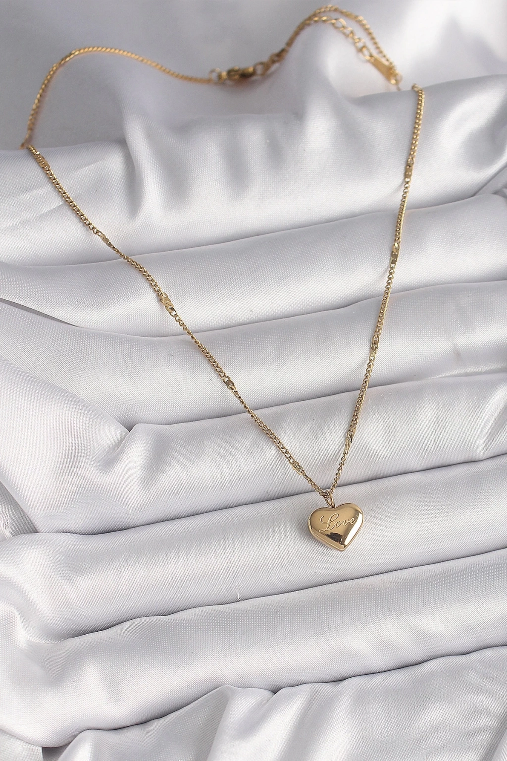 BFS 316L Çelik Gold Renk Zincir Love İşlemeli Kalp Figür Kadın Kolye