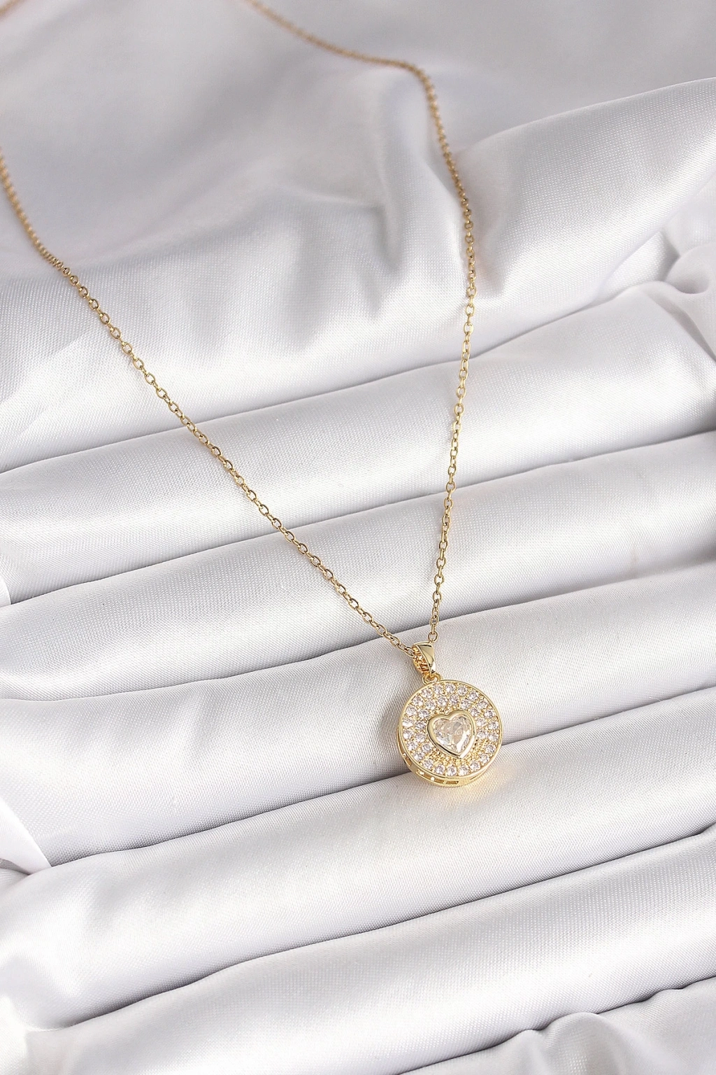 BFS 316L Çelik Gold Renk Zincir Madalyon Zirkon Taşlı Kalp Model Kadın Kolye