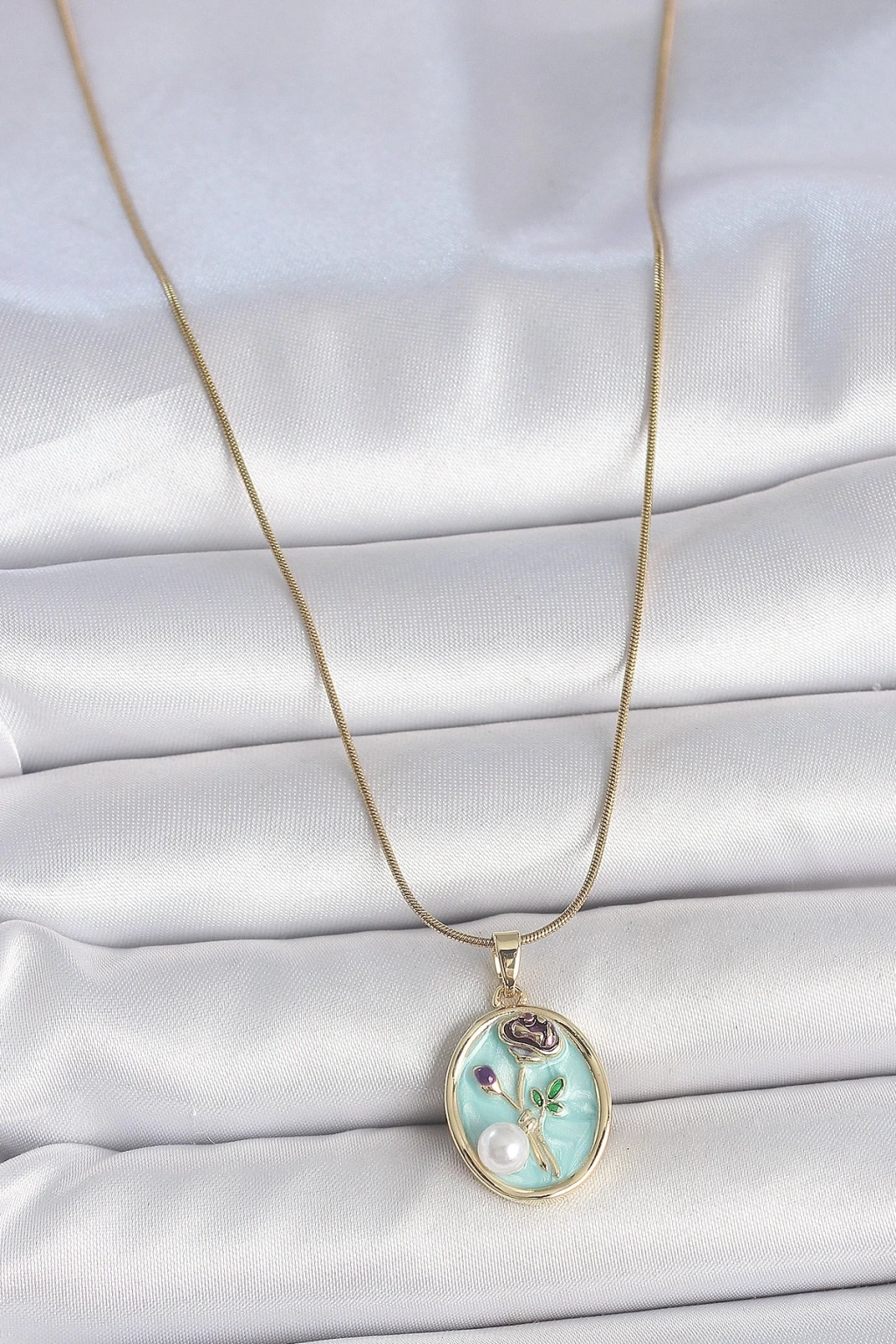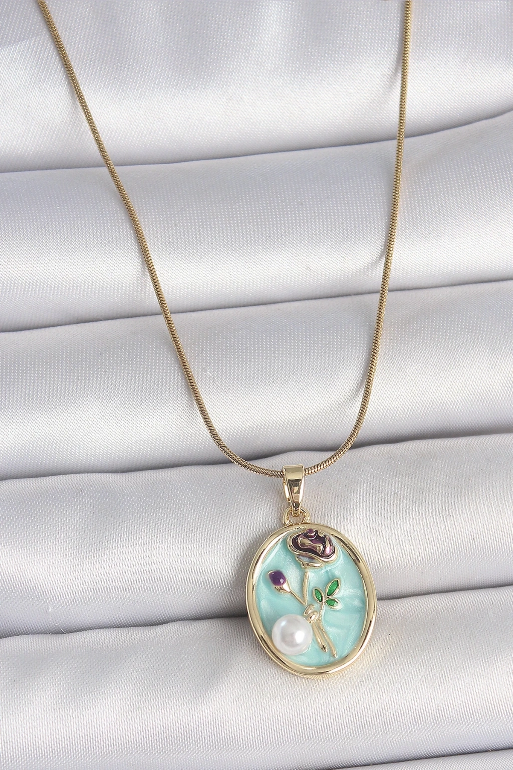 BFS 316L Çelik Gold Renk Zincir Mavi Çiçek İşlemeli İnci Detay Portre Model Kadın Kolye