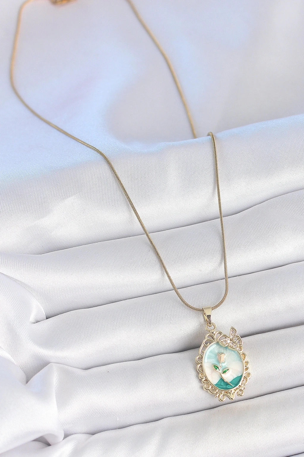 BFS 316L Çelik Gold Renk Zincir Mavi Mineli Çiçek İşlemeli Zirkon Taş Detaylı Portre Model Kadın Kolye