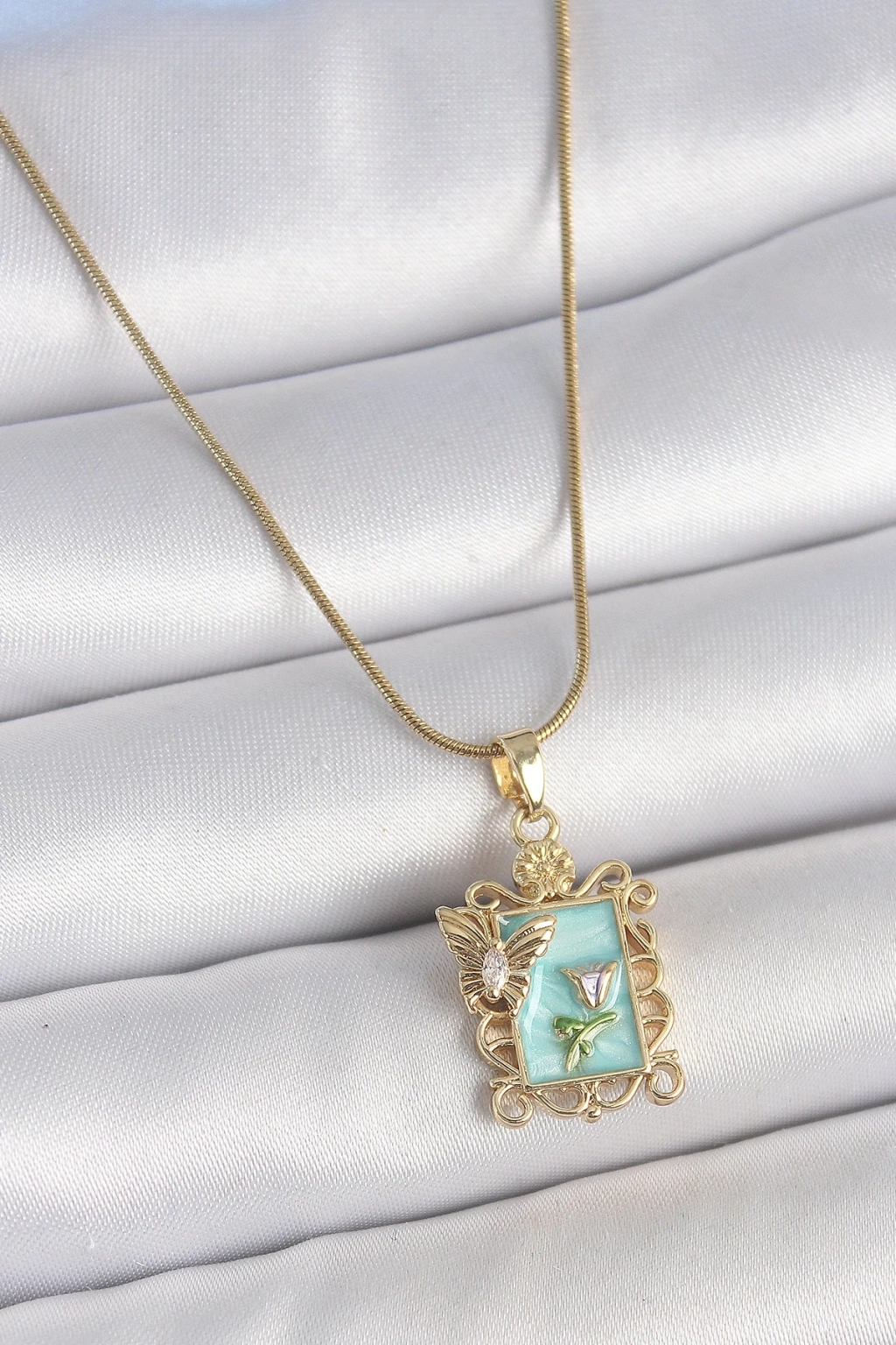 BFS 316L Çelik Gold Renk Zincir Mavi Mineli Çiçek İşlemeli Zirkon Taşlı Kelebek Detay Portre Model Kadın Kolye