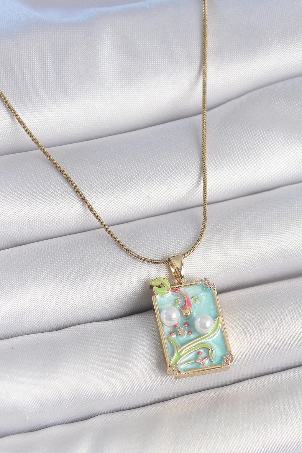 BFS 316L Çelik Gold Renk Zincir Mavi Mineli İncili Çiçek İşlemeli Portre Model Kadın Kolye