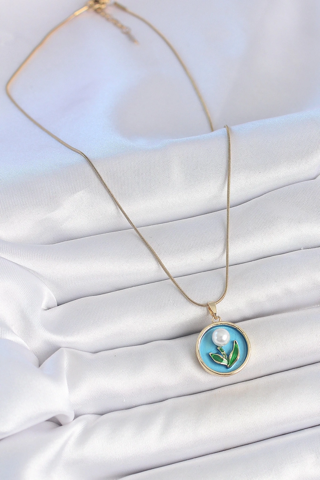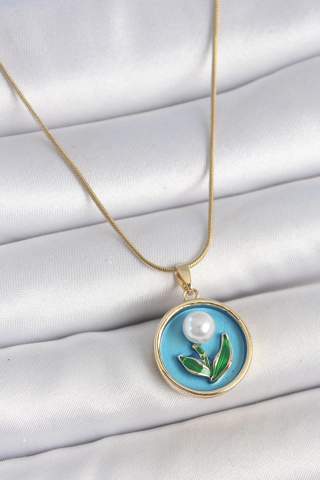 BFS 316L Çelik Gold Renk Zincir Mavi Mineli İncili Çiçek İşlemeli Portre Model Kadın Kolye