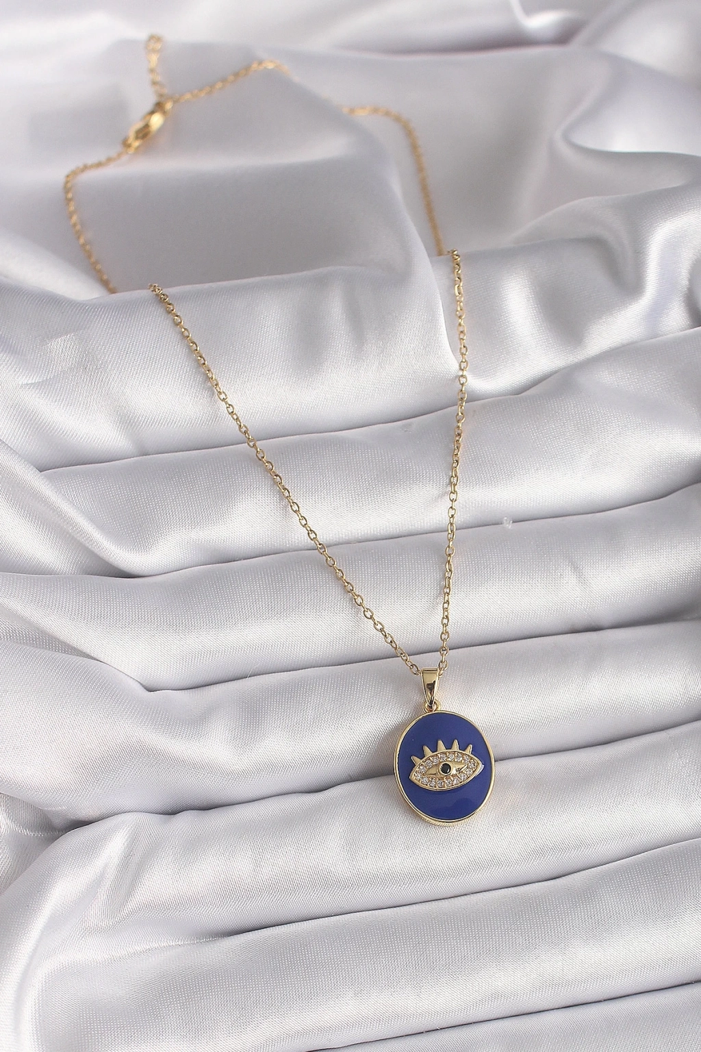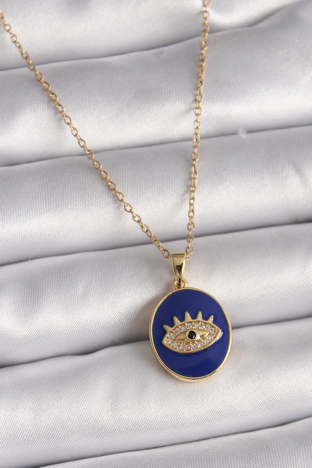 BFS 316L Çelik Gold Renk Zincir Mavi Mineli Zirkon Taşlı Göz İşleme Kadın Kolye