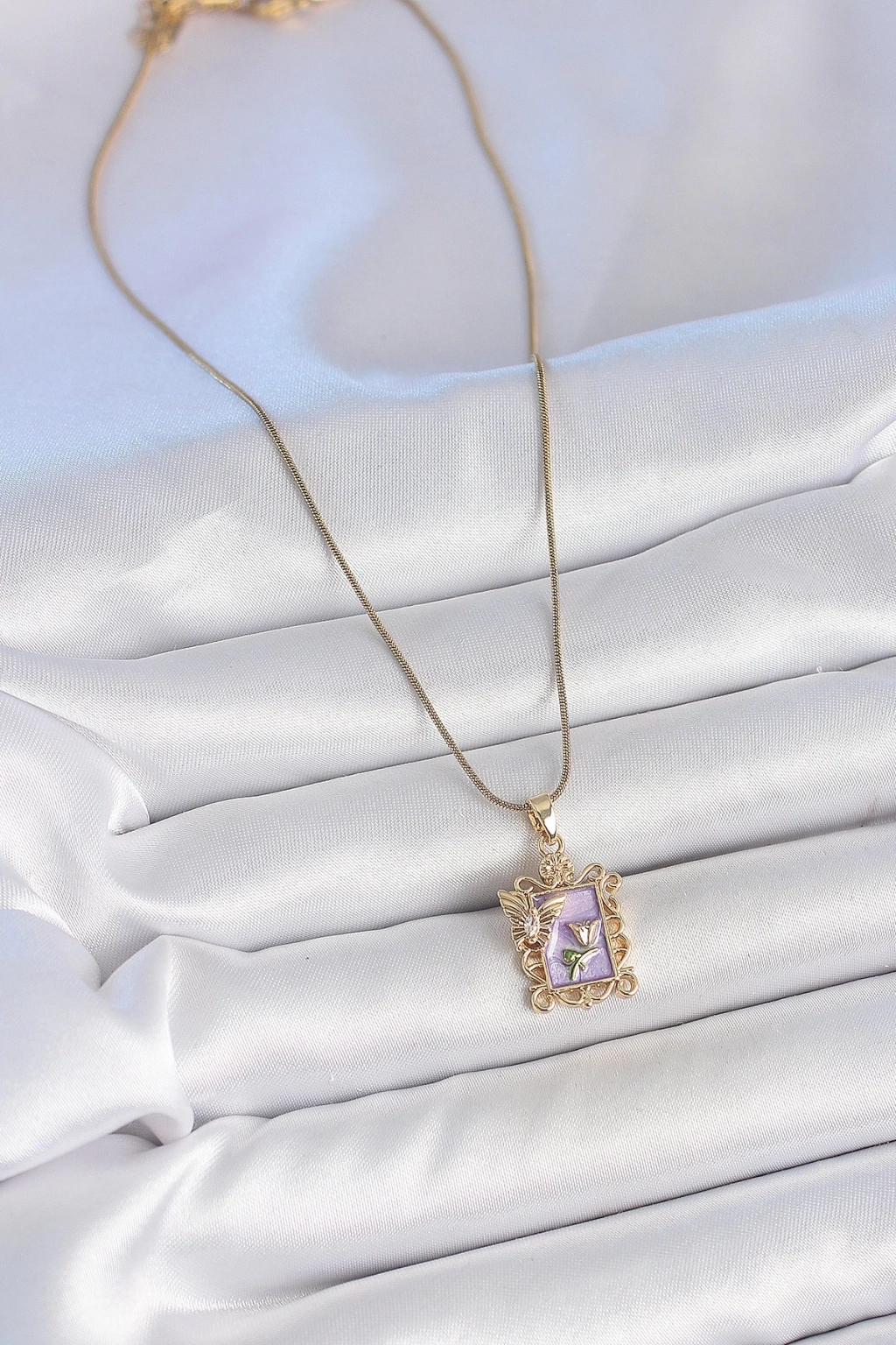 BFS 316L Çelik Gold Renk Zincir Mor Mineli Çiçek İşlemeli Zirkon Taşlı Kelebek Detay Portre Model Kadın Kolye