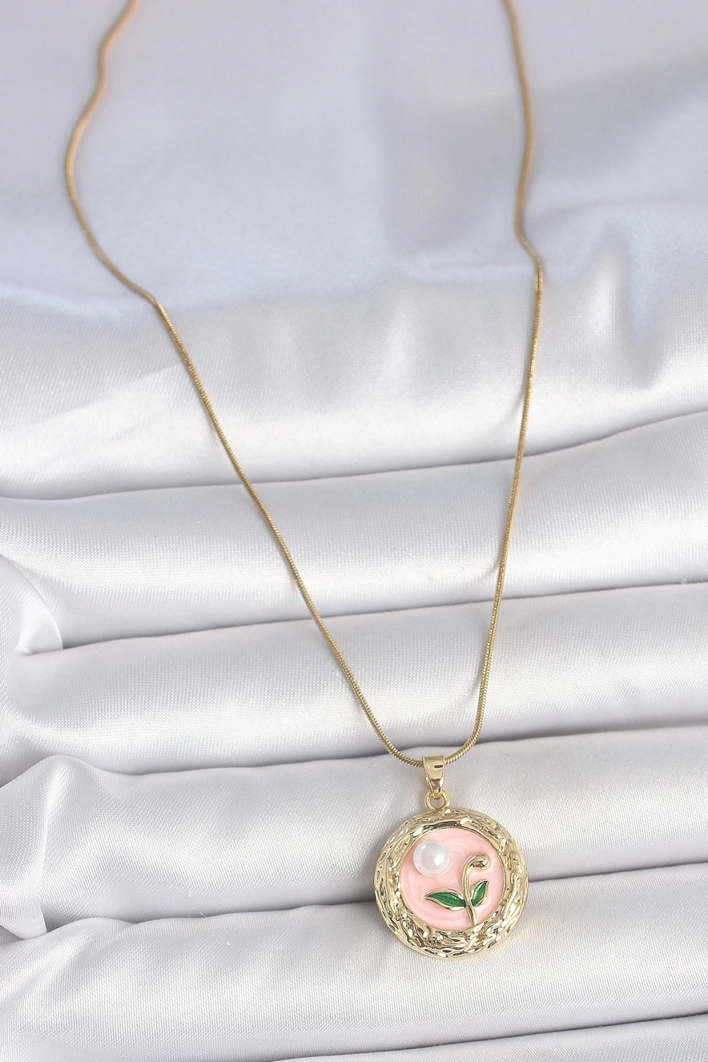 BFS 316L Çelik Gold Renk Zincir Pembe Çiçek İşlemeli inci Detay Portre Model Kadın Kolye