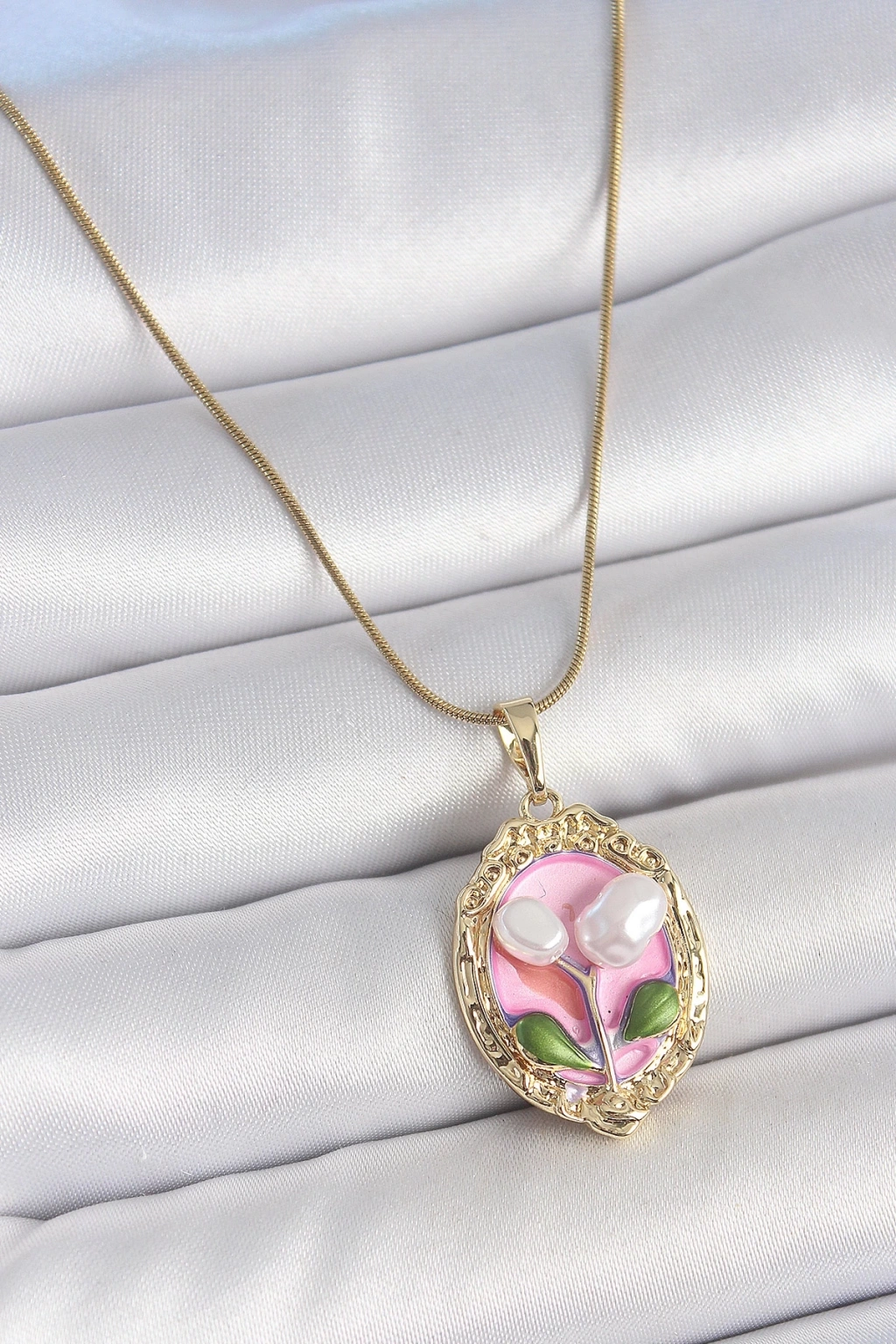 BFS 316L Çelik Gold Renk Zincir Pembe Mineli İncili Çiçek İşlemeli Portre Model Kadın Kolye