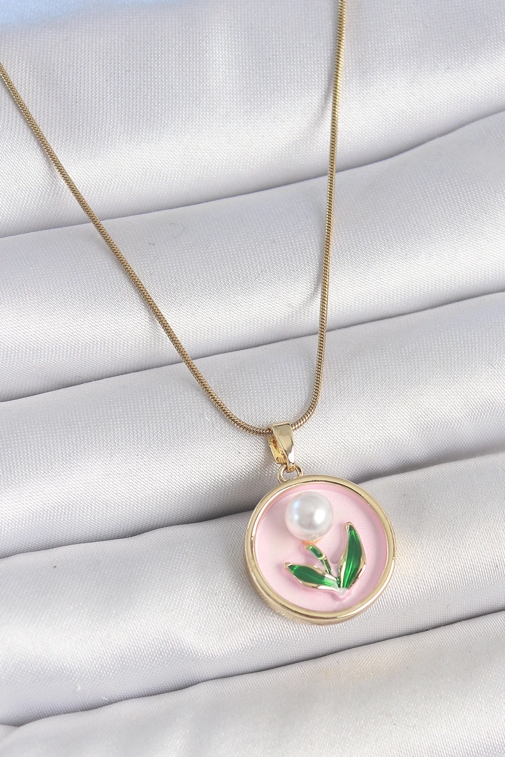 BFS 316L Çelik Gold Renk Zincir Pembe Mineli İncili Çiçek İşlemeli Portre Model Kadın Kolye