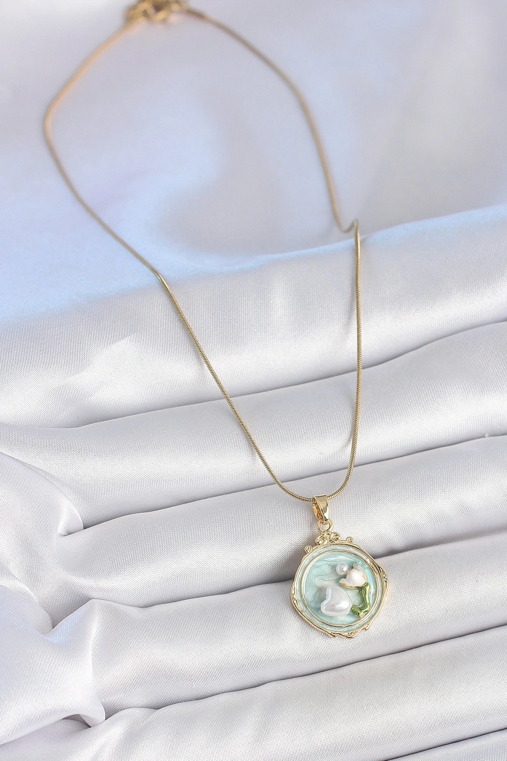 BFS 316L Çelik Gold Renk Zincir Turkuaz Mineli İncili Çiçek İşlemeli Portre Model Kadın Kolye