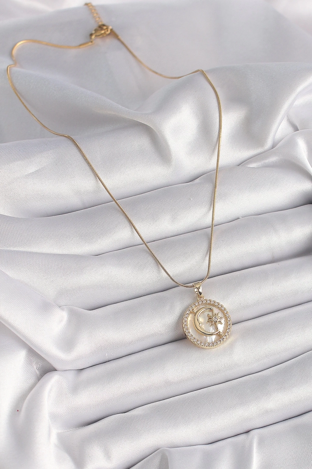 BFS 316L Çelik Gold Renk Zincir Zirkon Taş Detaylı Beyaz Sedefli Ay Yıldız Model Kadın Kolye