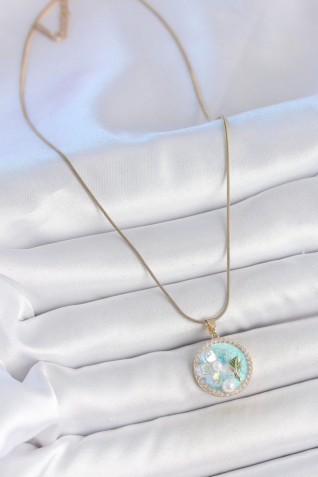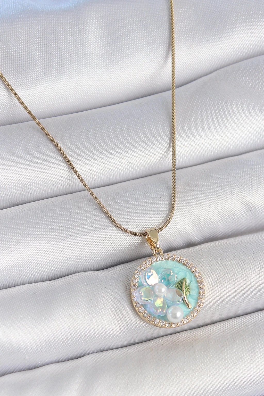 BFS 316L Çelik Gold Renk Zincir Zirkon Taş Detaylı Mavi Mineli Çiçek İşlemeli İnci Detay Kadın Kolye