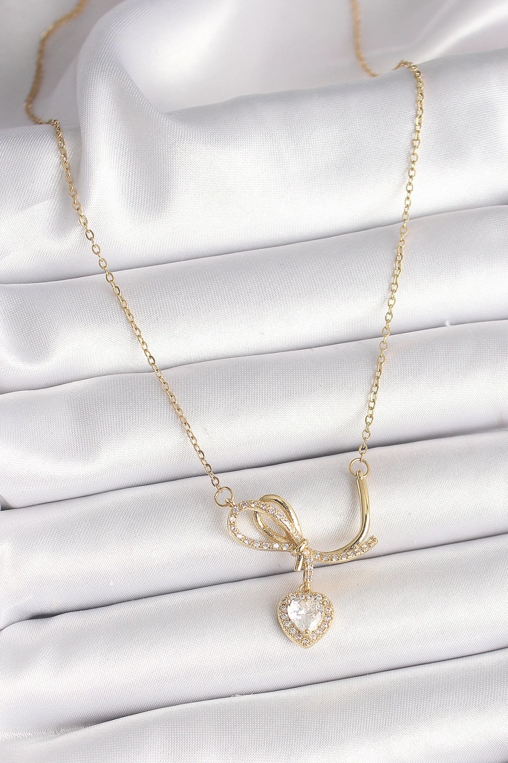 BFS 316L Çelik Gold Renk Zincir Zirkon Taşlı Düğüm Sallantı Kalp Model Kadın Kolye