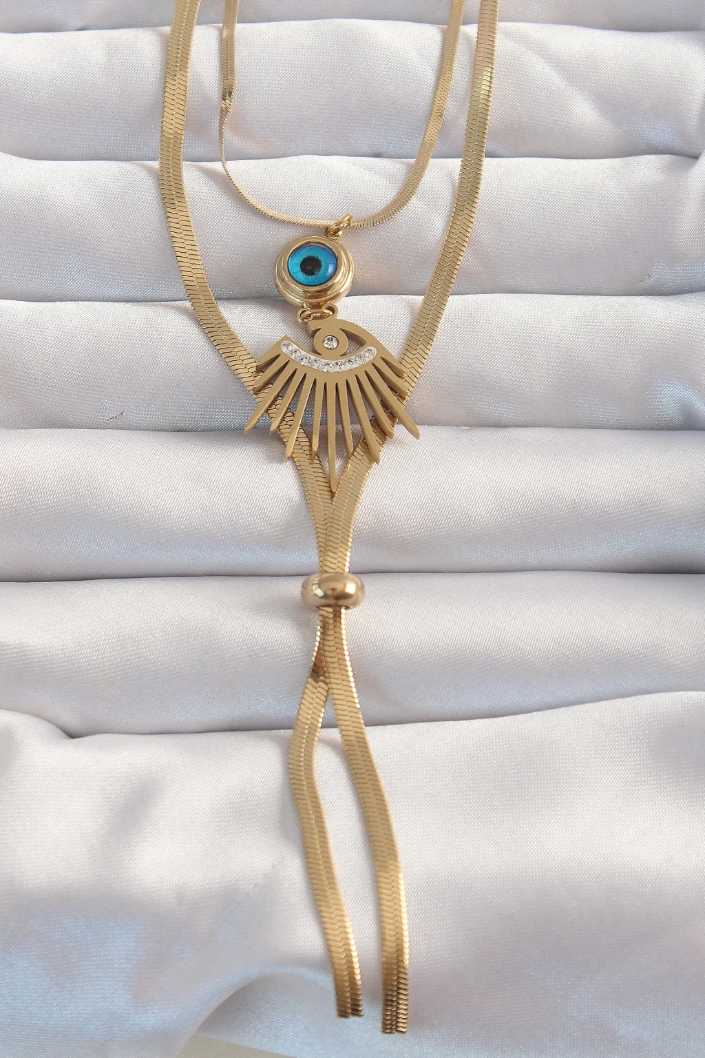 BFS 316L Çelik Gold Renk Zirkon Taşlı Göz Detay Nazarlı Uzun Asansör Model Kolye