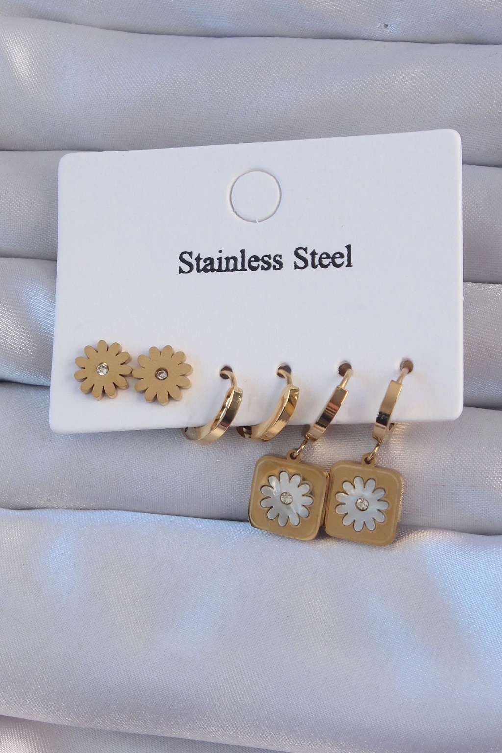 BFS 316L Çelik Gold Renk Zirkon Taşlı Sedefli Papatya Model Halka Küpe Seti