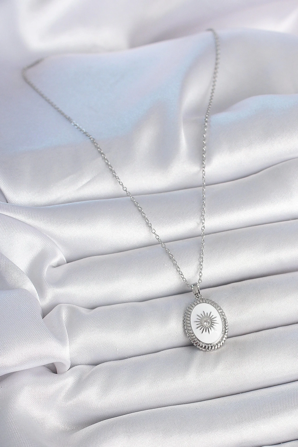 BFS 316L Çelik Gümüş Renk Beyaz Mineli Güneş İşlemeli Nazar Boncuk Detay Madalyon Model Kadın Kolye