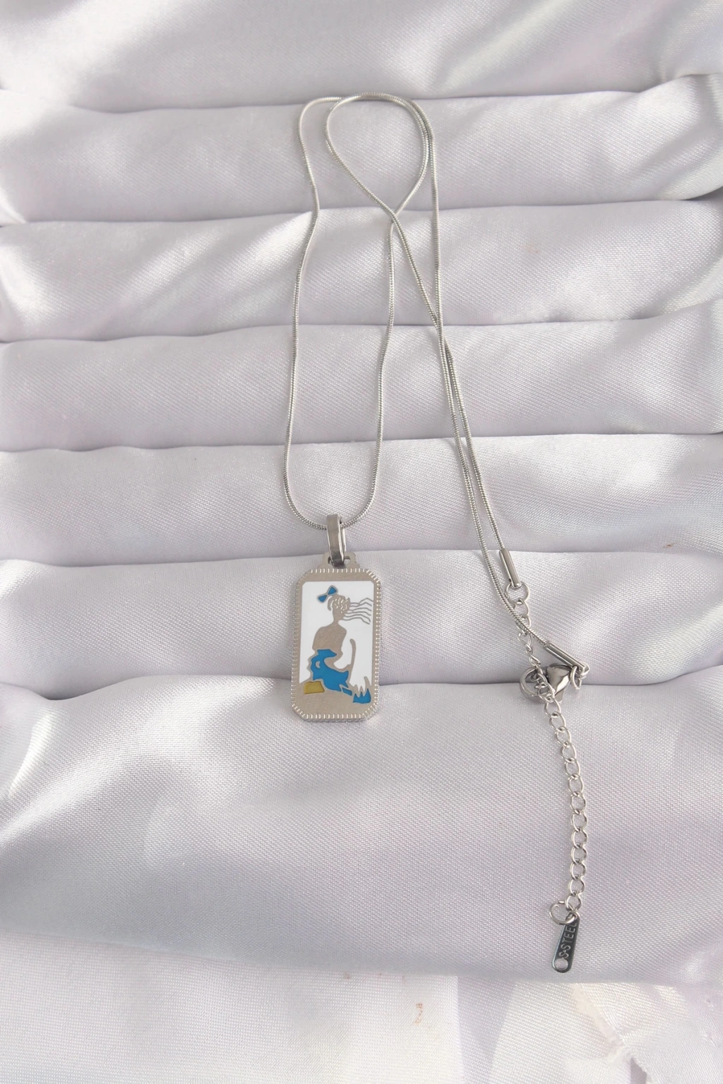 BFS 316L Çelik Gümüş Renk Beyaz Mineli Kız Figür Tarot Kolye