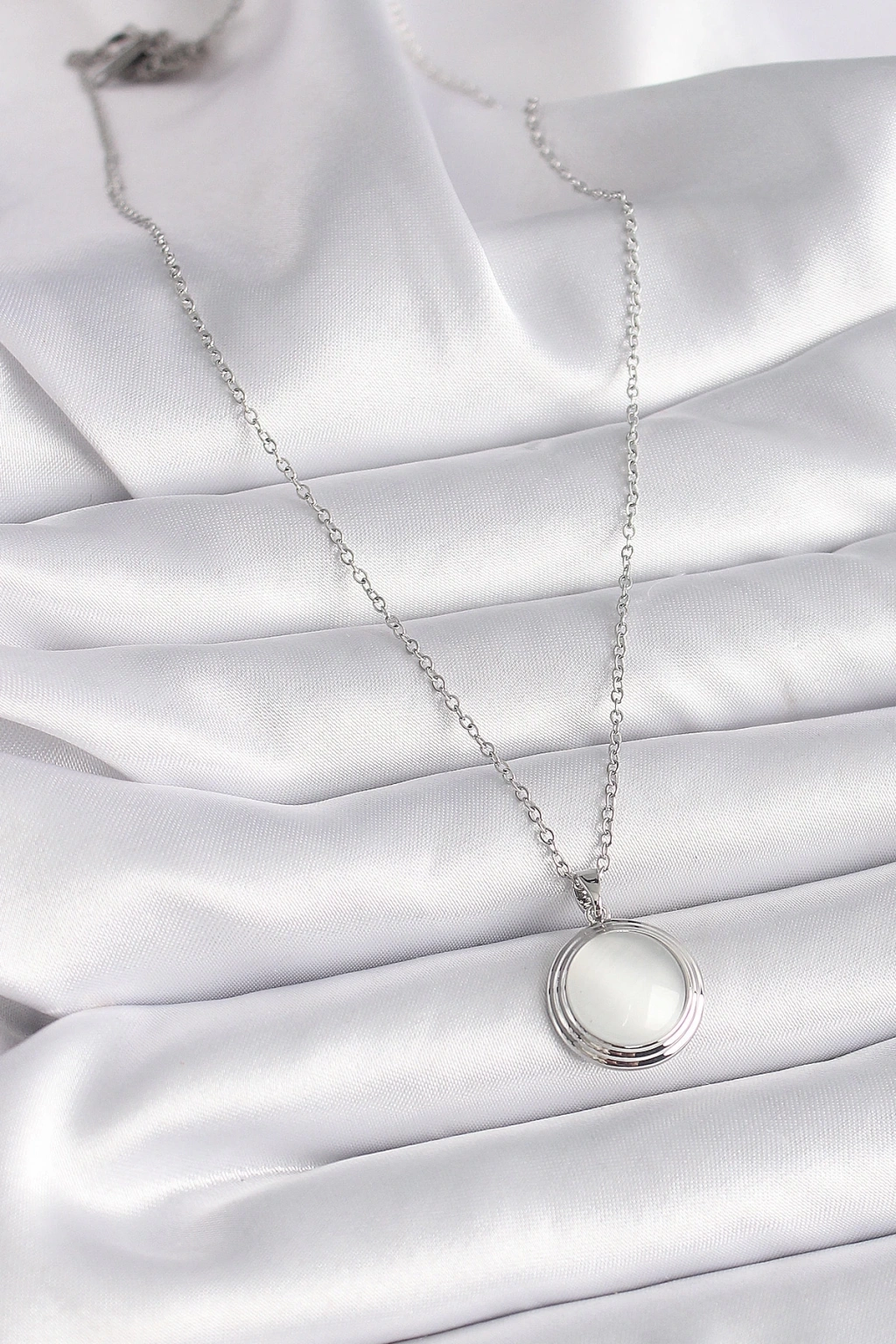 BFS 316L Çelik Gümüş Renk Beyaz Sedefli Daire Model Kadın Kolye