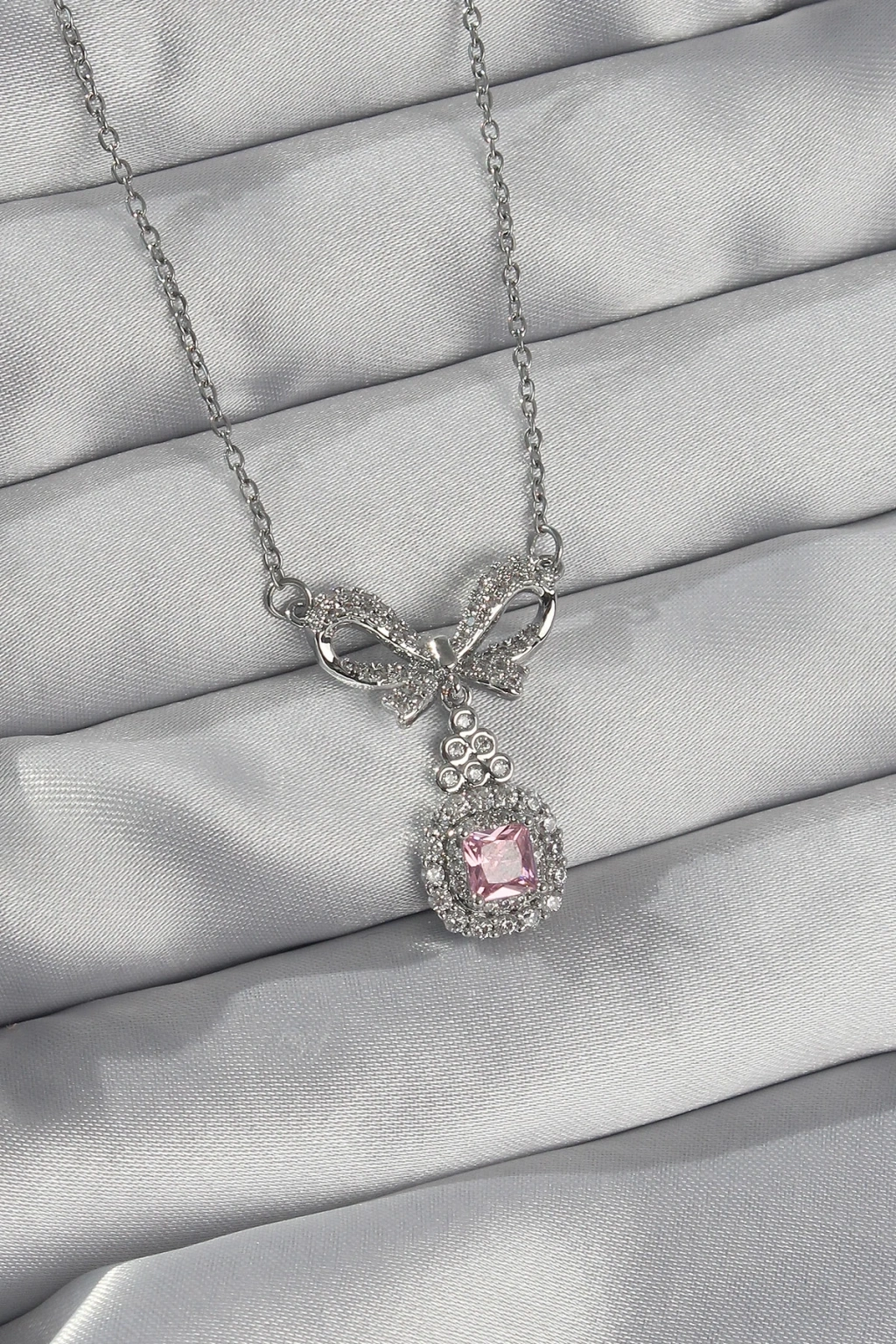 BFS 316L Çelik Gümüş Renk Fiyonk Detay Pembe Zirkon Taşlı Tektaş Kolye