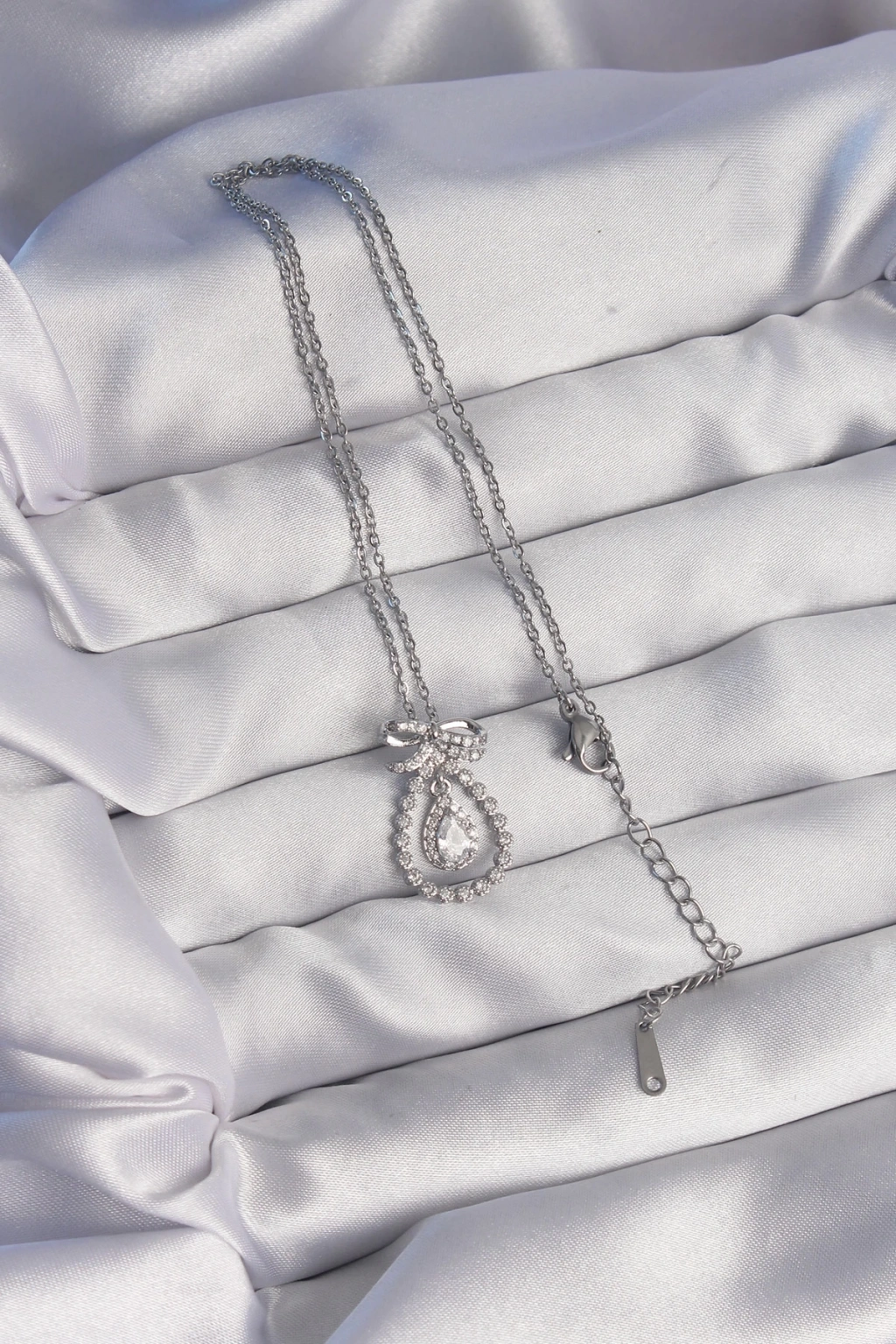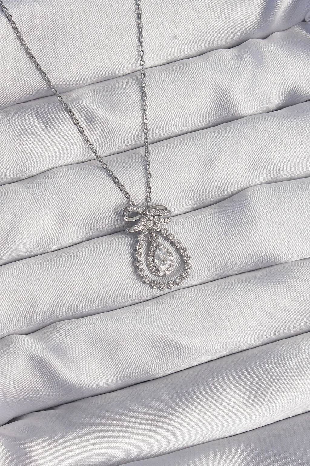 BFS 316L Çelik Gümüş Renk Fiyonk Detaylı Zirkon Taşlı Damla Model Kolye