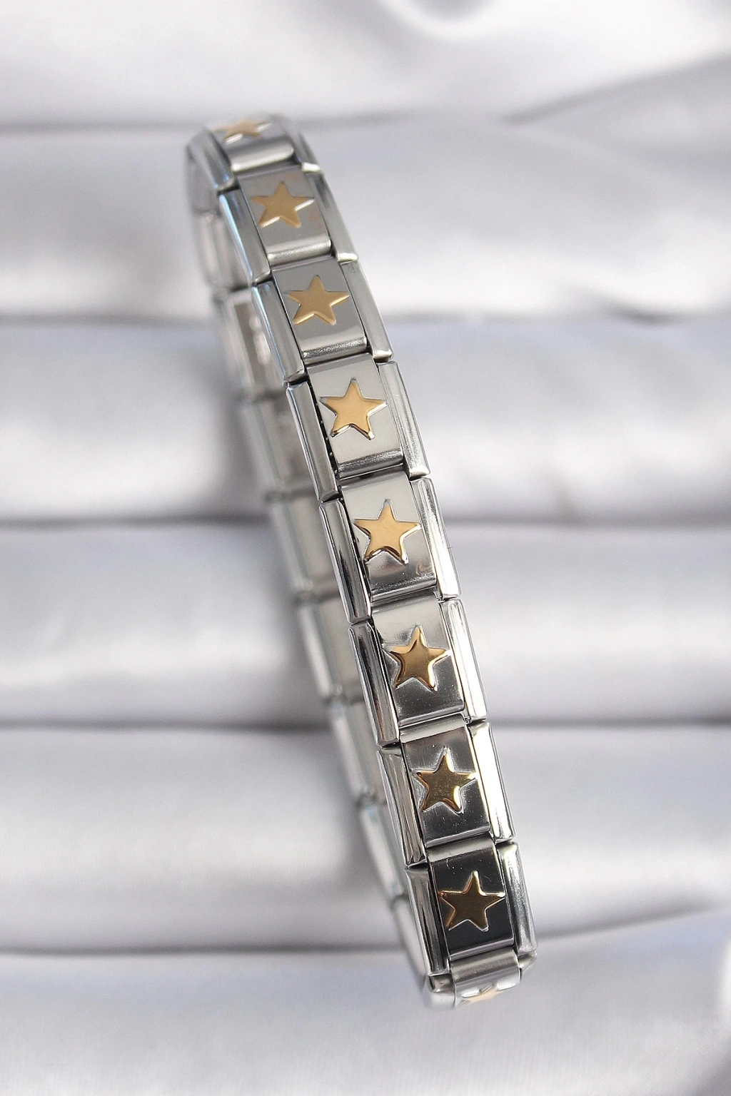 BFS 316L Çelik Gümüş Renk Gold Yıldız İşleme Nomination Charm Bileklik