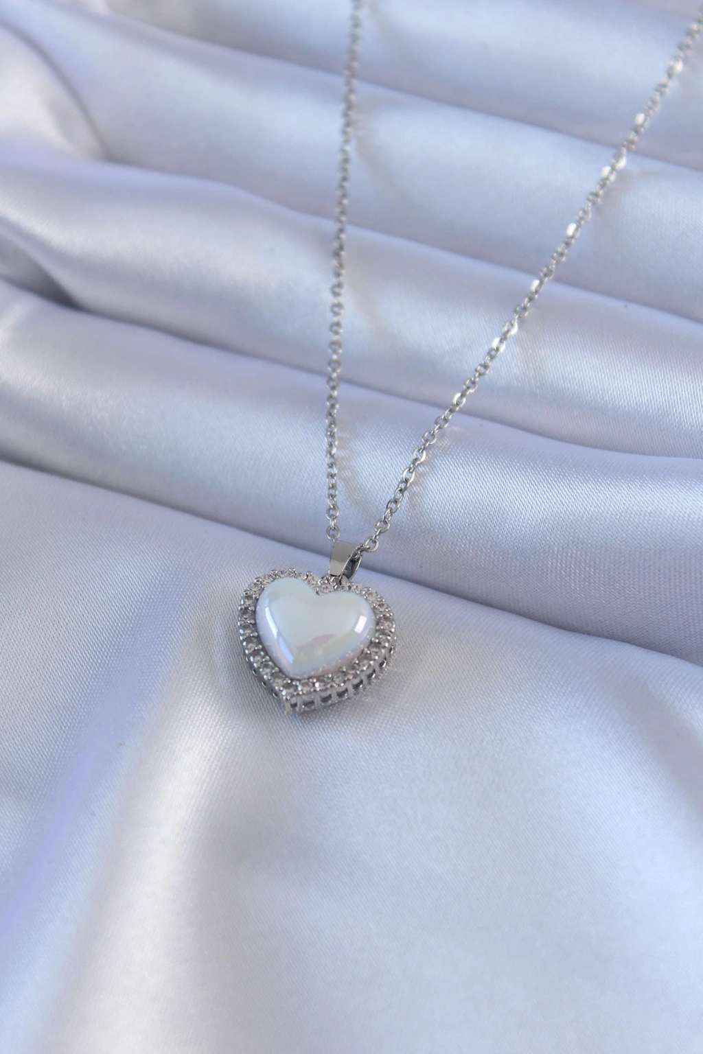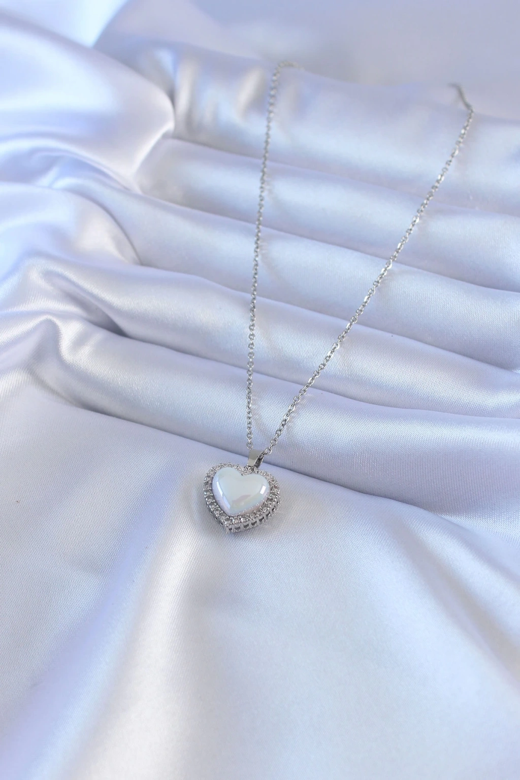 BFS 316L Çelik Gümüş Renk İncili Kalp Model Zirkon Taşlı Kadın Kolye