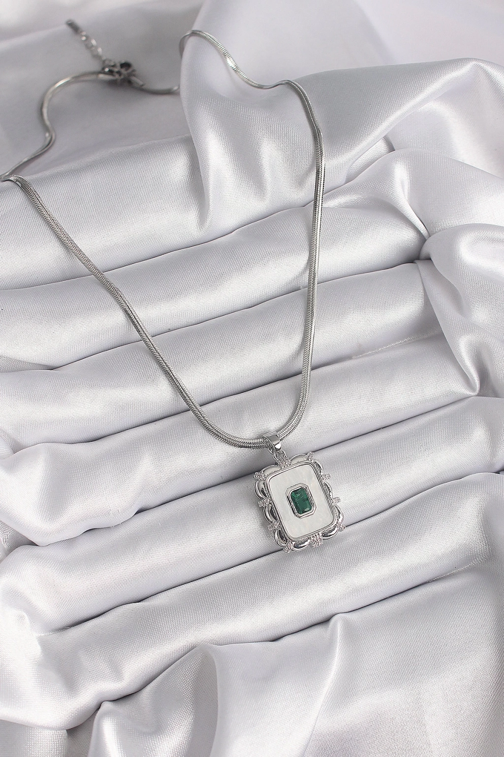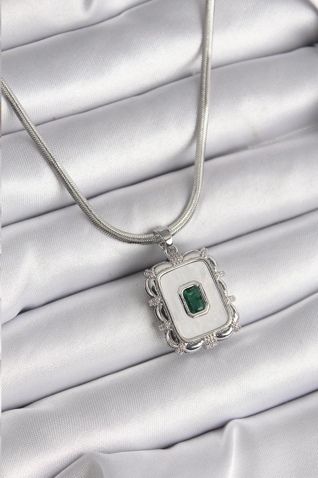 BFS 316L Çelik Gümüş Renk İtalyan Zincir Beyaz Sedefli Kare Portre Model Zümrüt Taş Detay Kadın Kolye