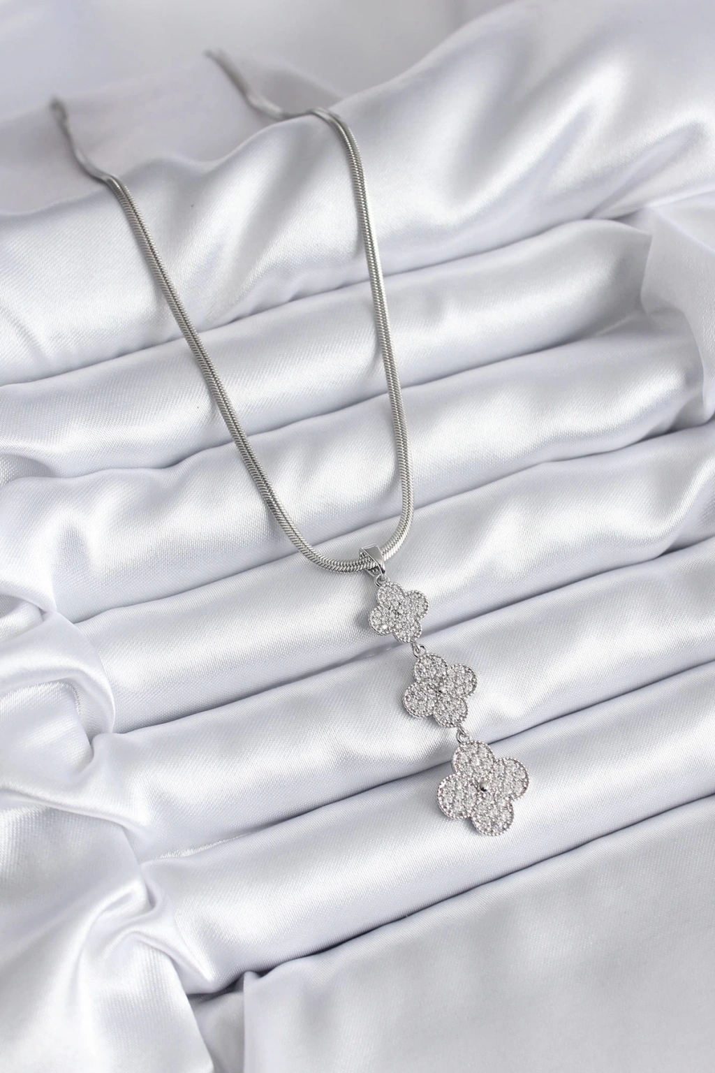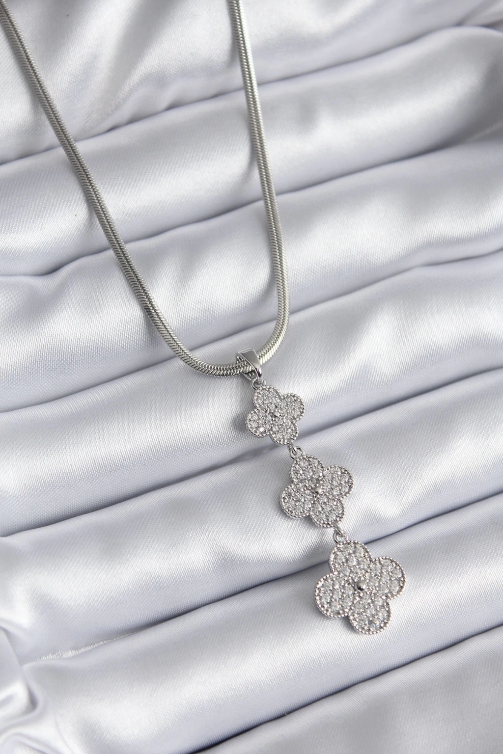 BFS 316L Çelik Gümüş Renk İtalyan Zincir Zirkon Taşı Yonca Model Kadın Kolye